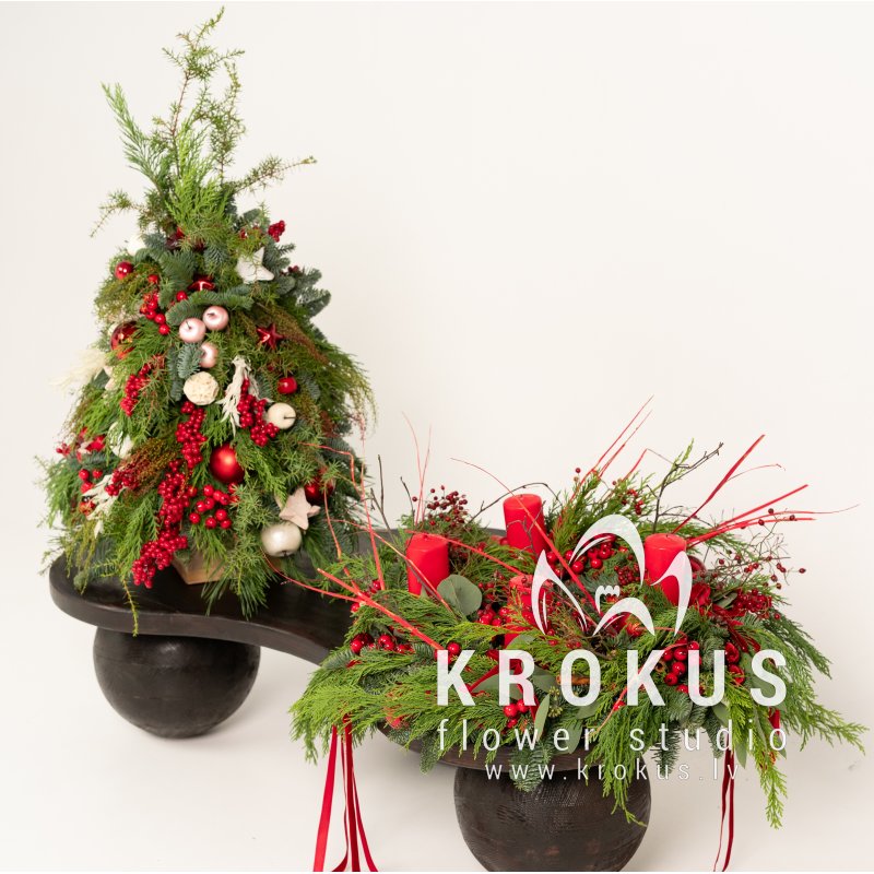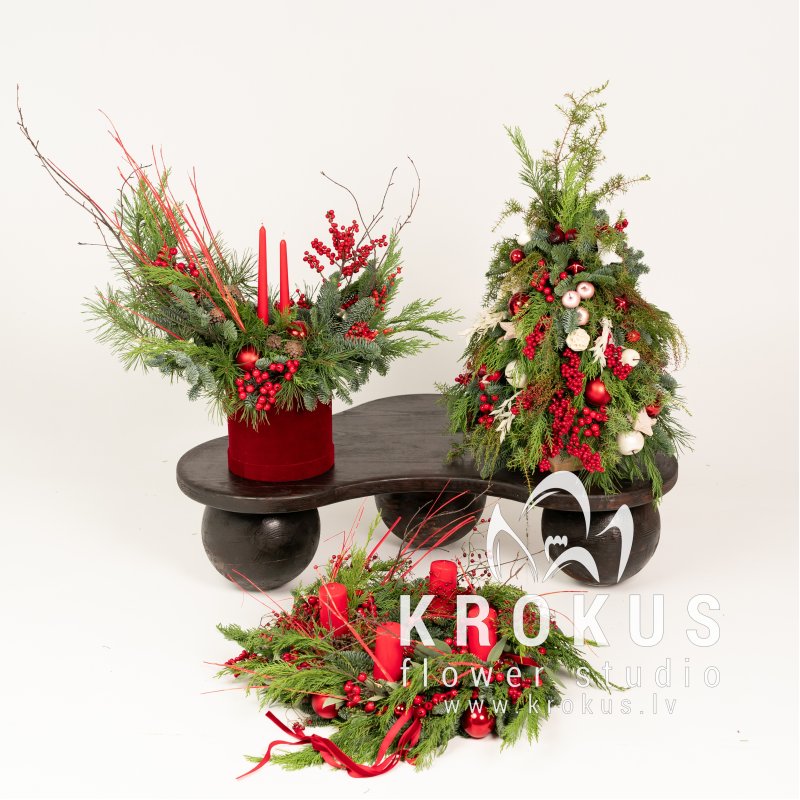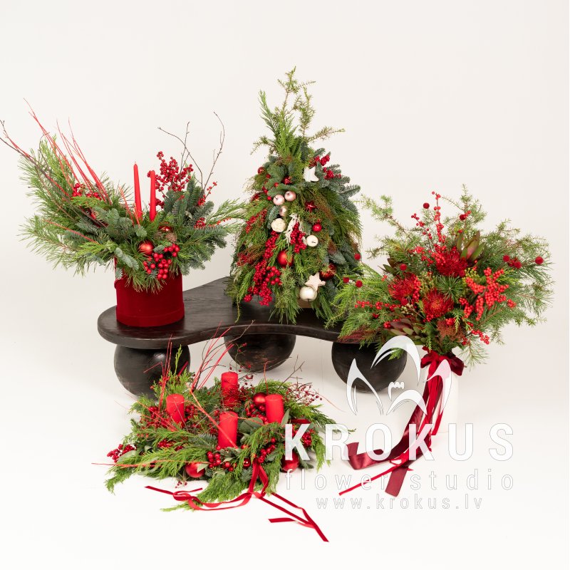 Christmas Decor – Unified Style Set – an elegant and harmonious decor set consisting of 2/3/4 compositions in a unified style. Featuring refined decorative elements, greenery, and velvet ribbons, this set creates a cohesive and luxurious festive atmosphere in your home.
