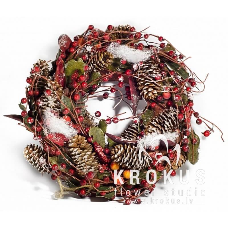 Lielisko Ziemassvētku vainagu rotā dabas dāvanas: ogas, prieža čiekuri, lapas un zari. Tā pauž skaistu pāreju no rudens uz ziemu. Šī Ziemassvētku dāvana izstaro brīvdienas šarmu. Jūs jutīsieties kā plūstošs siltums ap Jums un jūsu mīļajiem.