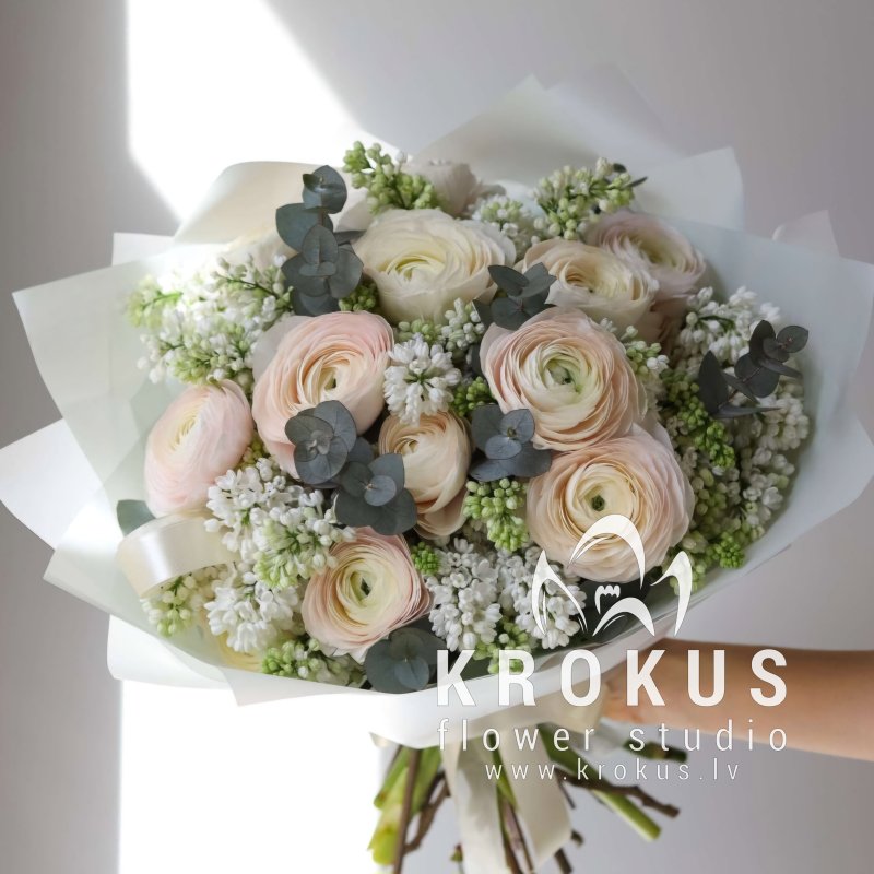 Balto ceriņu un ranunkuļu pušķis