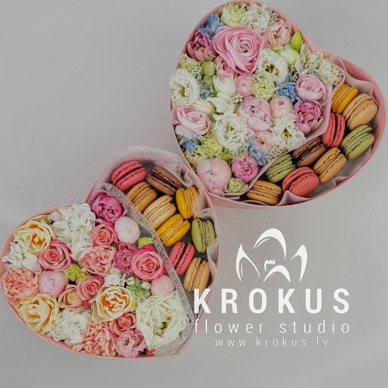 Flowerbox ar macaroons cepumiem - moderna dāvana cilvēkiem, kas iet vienā solī ar modi. Toņus florists izvēlās katram pasūtījumam individuāli, pamatojoties uz Jūsu vēlmēm. Komentārā varat norādīt vēlamo krāsu shēmu un summu- balsoties uz šo informāciju izveidosim skaistu kasti ar ziediem un macaroon cepumiem. Komentāri tiek ņemti vērā un tiek izpildīti iespēju robežās, atkarībā no ziedu pieejamības.