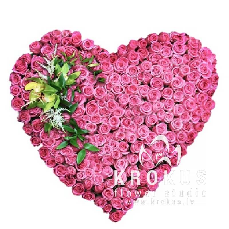 Eleganta sirds no rozēm - pasakaina dāvana Jūsu mīļotajai. Šāda dāvana ir katras sievietes sapnis. Rožu mākonis piepildīs veselu istabu ar šo burvīgo aromātu. Lielisks pušķis Valentīna dienā izskatās vienkārši neatvairāms! Jūsu mīļotās laimīgais smaids būs kā atlīdzība par Jūsu jūtām, kas ir tik pat pilnīgas, kā šī sirds.