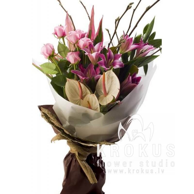 Mākslinieki - floristi studijā Krokus radīs Jums neparastu pušķi. Šis ir viens no tiem. Tas ir patiesi iedvesmojošs un kalpos kā lieliska dāvana daudzās situācijās. Grieztie rozā un krēmveida rozes veido iespaidīgu kontrastu ar plīša lilijām. Rozā antūrijas, kuri arī ir iekļauti pušķī, pauž potenciālu un lielu iekšējo spēku.