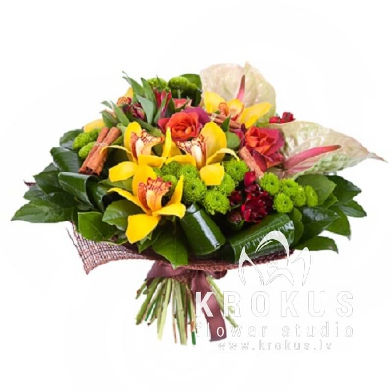 Elegantam pušķim no rozēm, orhidejām, antūrijām un kanēļa standziņām piemīt jauka pikanta smarža. Patiesi vēlama dāvana jebkuriem dzīves gadījumiem. Savstarpēji ziedu krāsas ir nedalāmas kā Yin un Yang. Un pretēji - kā balets un kaislīga spāņu deja. Izturēts un elegants Jūsu ziedu kompliments noteikti nepaliks nepamanīts!