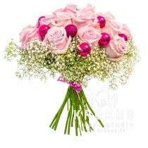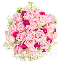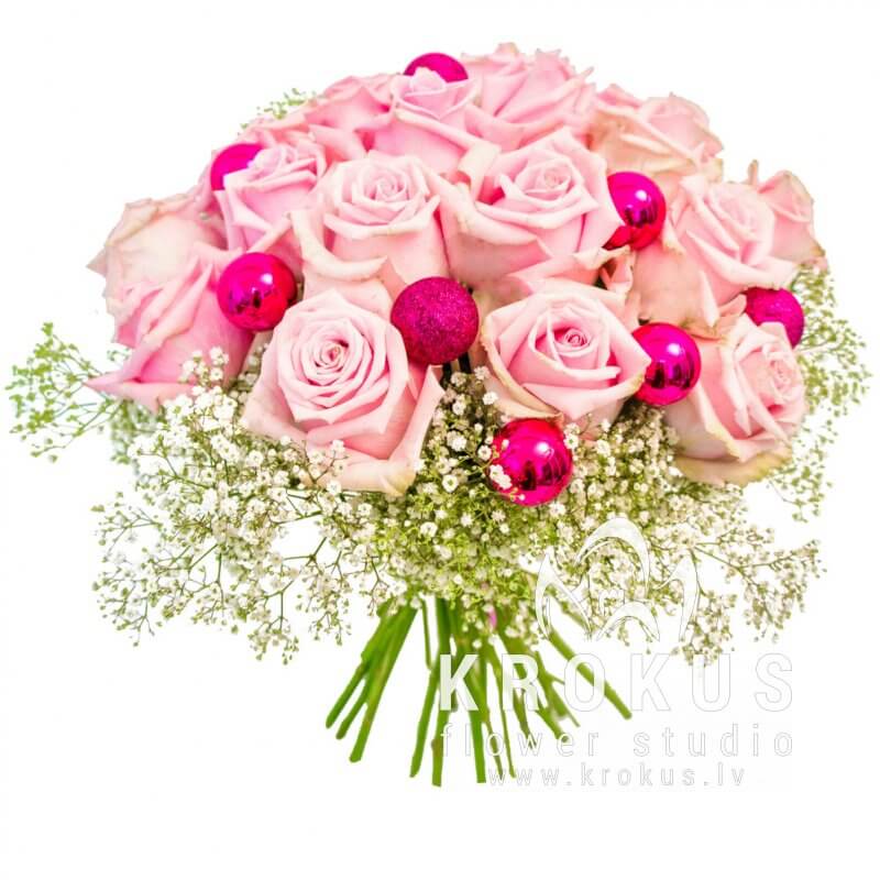 Ļoti mīļš Ziemassvētku pušķis. Maigi-rozā rozītes ieskautas baltā gipsofilu mākonī un noformētas ar Jaungada bumbām. Ļoti jauka un negaidīti saņem dāvanu pušķi no svaigiem ziediem burvīgajā ziemas laikā Dāvināt Ziemassvētku kompozīcijas pēdējā laikā ir ļoti populāri. Tie radīs svētku noskaņu un izrotāt māju.