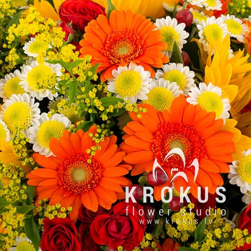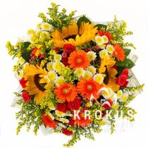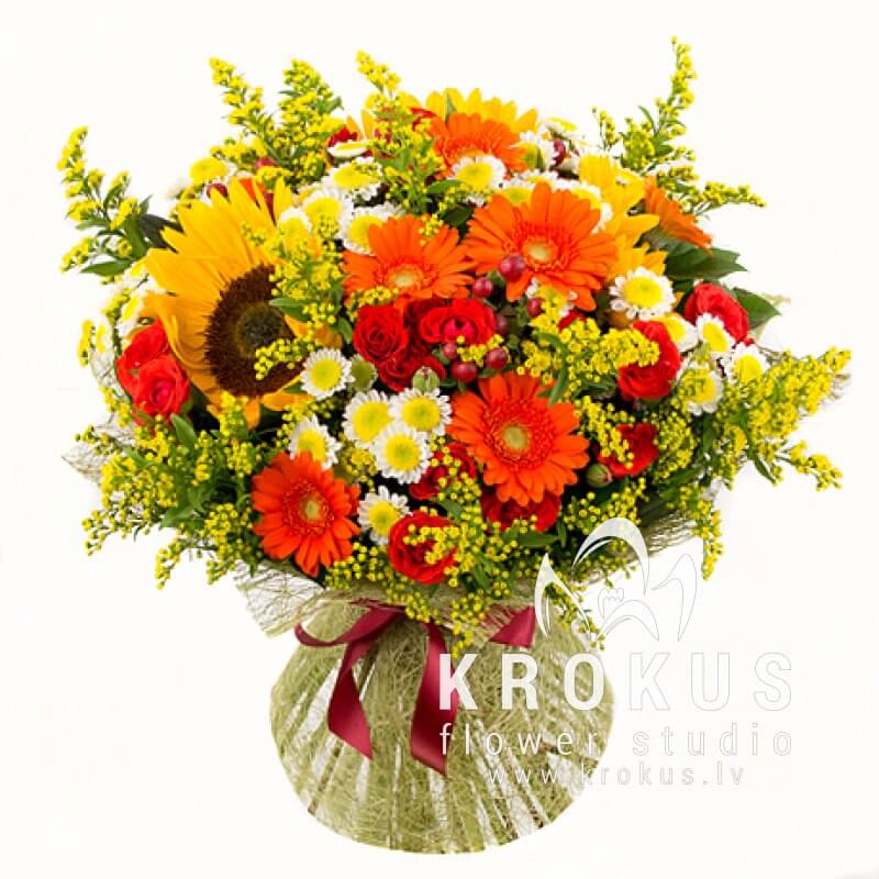 Lielais, skaistais ziedu pušķis - simbols saules enerģijai. Tas ir tas, kas Jums vajadzīgs, lai paaugstinātu sev garastāvokli. Mums sanāca krāsains mikss no vasarīgajām saulespuķēm, oranžajām gerberām, romantiskajām krizantēmām, rozēm un solidagām. Negaidīta un drosmīga kombinācija! Silto un spilgto krāsu mirdzumu rada saulespuķes un gerberas. Kas kļuva par galveno uzmanības centru kompozīcijā.