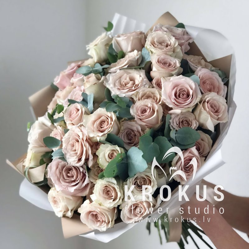 Rozes pušķis ar eikaliptu – izsmalcināta kompozīcija maigos pūdertoņos. Maigas rozes un aromātiskais eikalipts veido izsmalcinātu harmoniju, kas ir ideāli piemērota dāvanai dzimšanas dienā, jubilejā, kāzās vai vienkārši, lai izteiktu Jūsu jūtas. Svaigu ziedu piegāde Rīgā tajā pašā dienā. Pasūtiet tagad!
