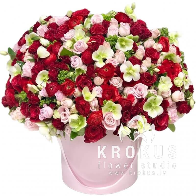 Fotogrāfijai ir ilustratīvs nolūks. Kastes krāsa un pušķa sastāvs var nedaudz atšķirties no attēlā redzamā.