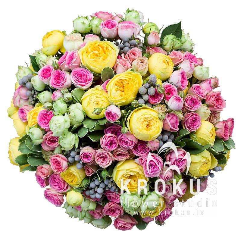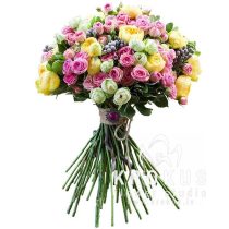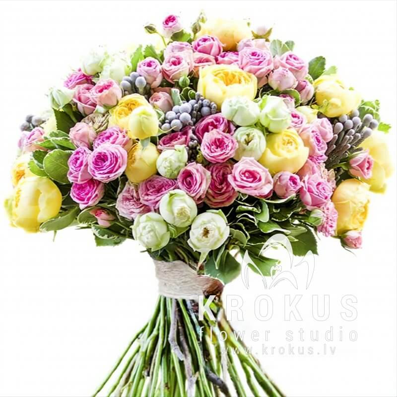 Liels angļu peonijveidīgo krūmrožu pušķis.Skaistais ziedu pušķis veidots no karalisko ziedu baltajiem ,rozā un dzeltenajiem zariņiem.Tam pievienotas eksotiskās brunijas bumbiņas un balti zaļās pittosporuma lapiņas.Pušķī nav nekā lieka - mēs to rūpīgi pārsējām ar sizāla diegu un izrotājām ar brošu.