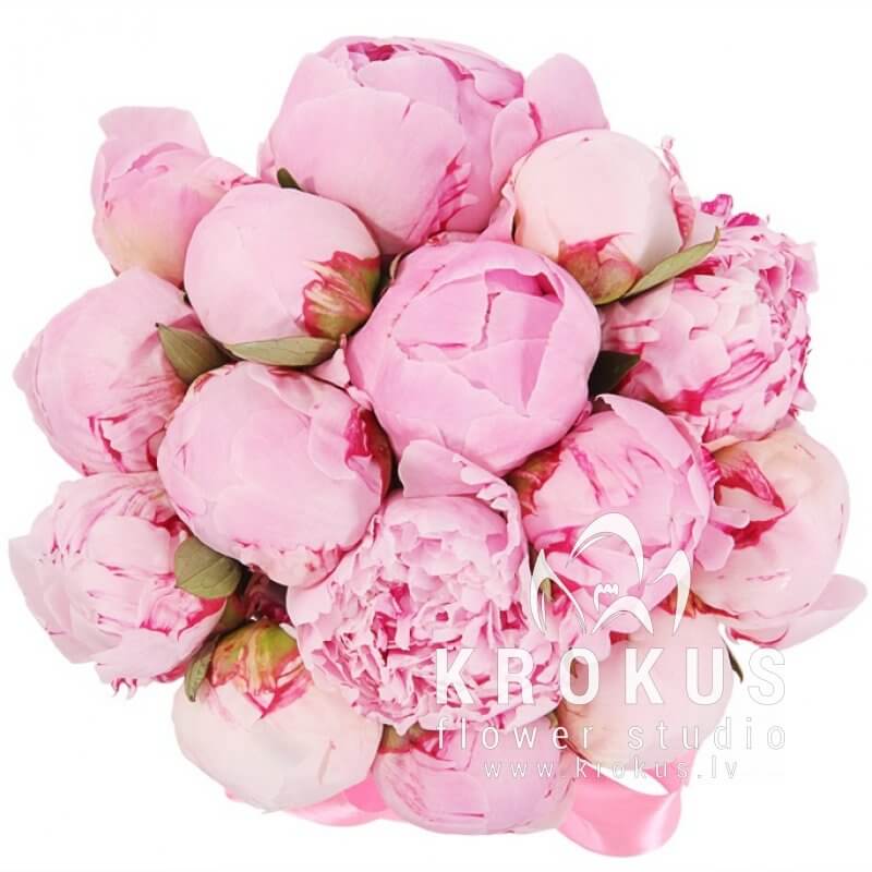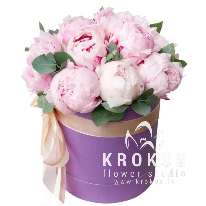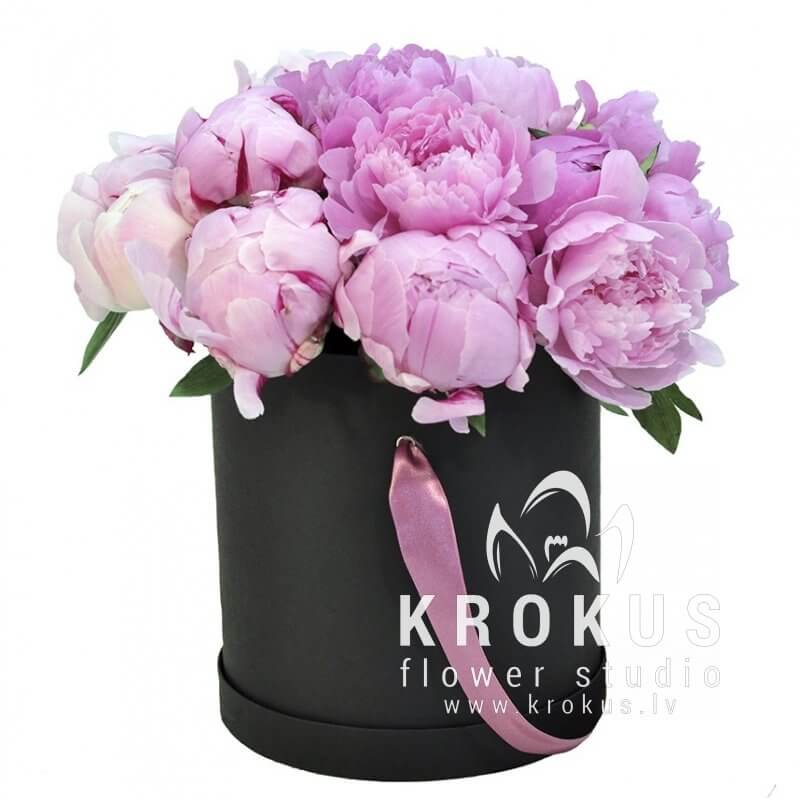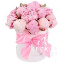 Rozā peonijas cepuru kastē