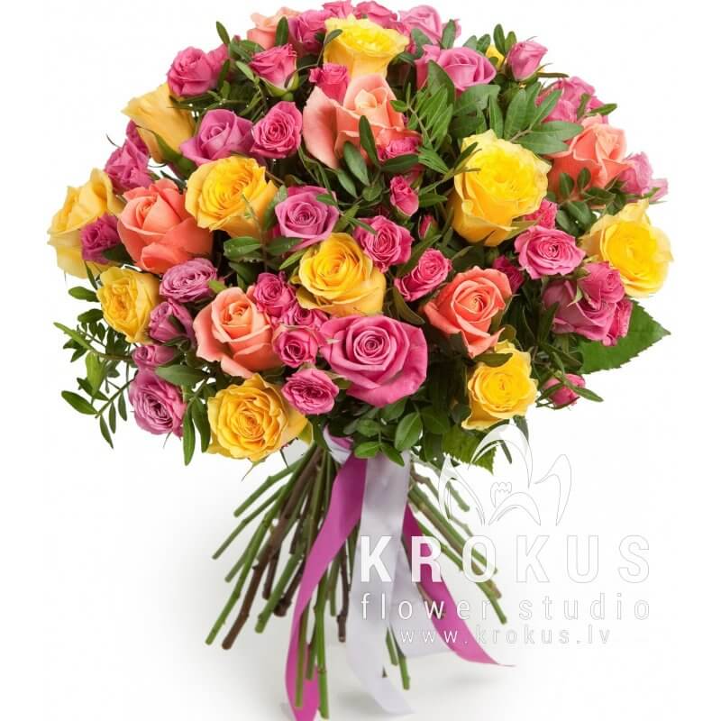 Neapšaubāmi, katra sieviete sapņo atrasties rožu dārzā. Uzdāviniet viņai tādu iespēju! Maigo ziedu juceklis un aromāts viņu sajūsminās.Skaistais daudzkrāsaino rožu pušķis līdzīgi saulītei iespīdēs viņas dzīvē.
