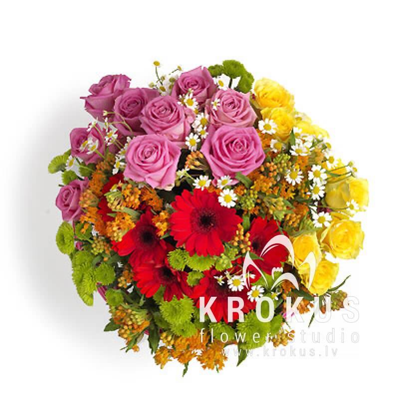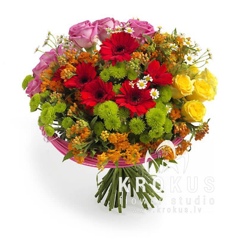Pušķis tika izveidots, lai rotātu atvaļinājumu vai izveidotu pozitīvu lādiņu darba dienas vidū. Galvenā uzmanība tiek vērsta uz gerberām. Tie padara pušķi dzīvāku ar savu formu un lielumu. Garastāvokli uzlabos arī īpaši mirdzošās zeltaini dzeltenās rozes un krizantēmas pogas. Skaistu pušķi ietin iepakojumā, kas ir izgatavots no dabīgajiem materiāliem un pārsien ar klasisku lenti.