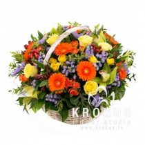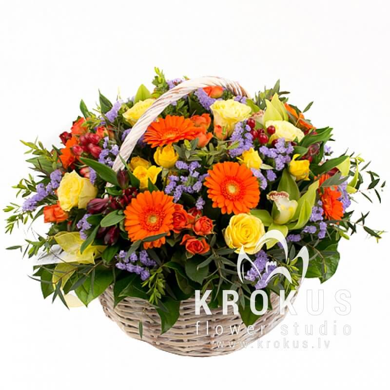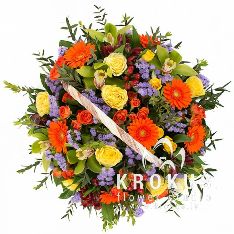 Laba dāvana, kad laukā ir slikti laika apstākļi. Liels grozs ar spilgtiem, svaigiem krāsu toņiem uzmundrinās Jums svarīgu cilvēku. Kompozīcijā nav nekā neparasta, tikai vienkārši skaisti ziedi. Bet tik un tā tas rada svinīgu svētku efektu. Grozs piepildīts ar rožu pumpuriem, saulainajām gerberām, krasainajām staticejām, alstromērijām un hypericiuma, kā arī tropu orhidejām.