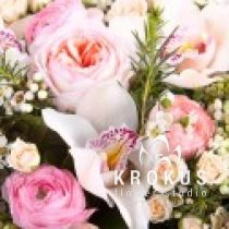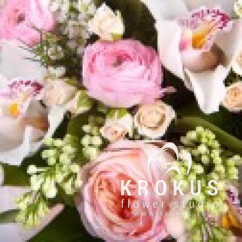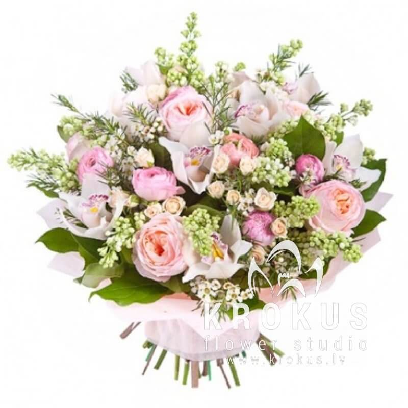 Ziedu pušķis sastāv no angļu rozēm, baltiem ceriņiem, krūmrozēm, pavasara ranunkuļiem un baltām tropu orhidejām. Lai pušķis būtu gaisīgs, ir pievienoti vaksflauveri, kas atgādina ziedošo sakuru. Gaišs, gaisīgs pušķis ietīts vieglā iepakojumā, tikpat maiga kā pati kompozīcija. Zīda lente dod attēlam gatavo izskatu.