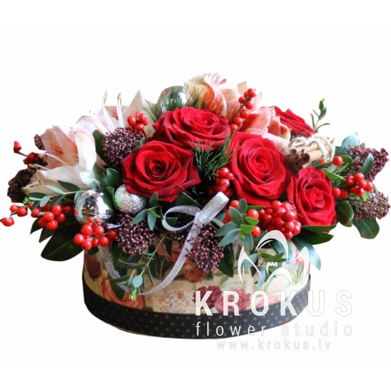 Ziemassvētku kompozīcija sastāv no smaržīgām rozēm, svētku amarilisiem, spilgtam Ileksa ogām, unikāls skimijas zariņiem, eikalipta, priežu skujām, kanēļa un Ziemassvētku dekorācijām. Kompozīcija ir ielikta speciālā florsitikas sūklī un Jums nebūs jālauca galva, kādā vāzē viņu ielikt. Viegli pārvadāt, ziemīgais sastāvs neatstās vienaldzīgu nevienu, tas patiks gan sievietēm, gan vīriešiem. Ja vēlaties uzdāvināt ziedu kompozīciju Ziemassvētkos, tad tas ir tas, kas Jums vajadzīgs.