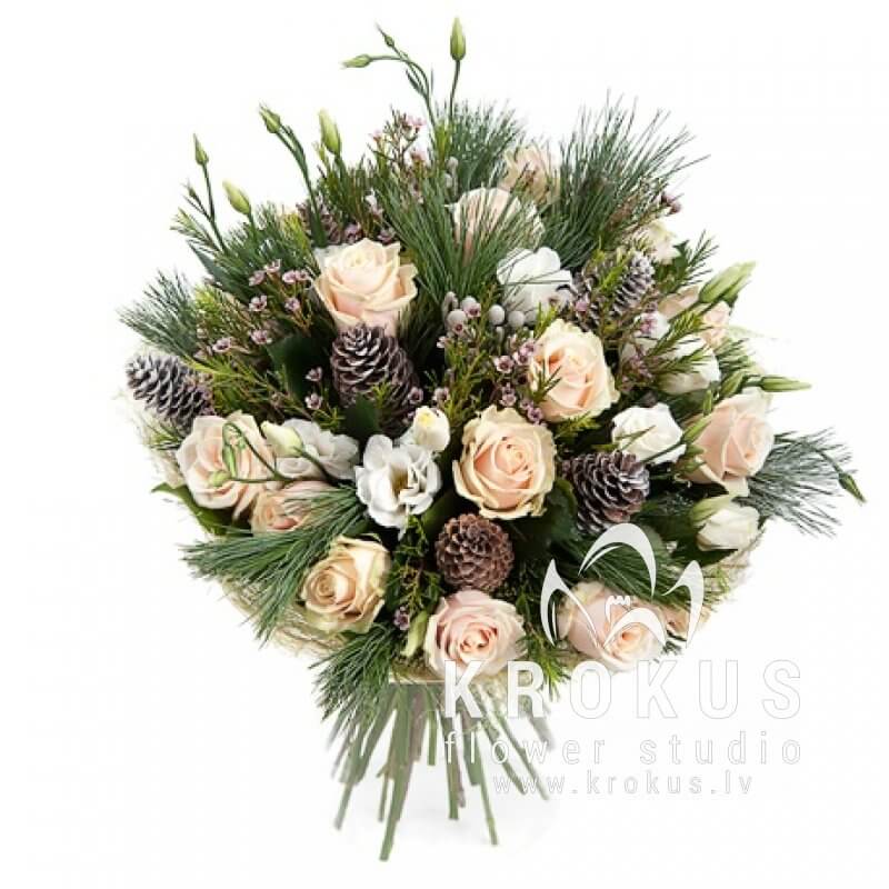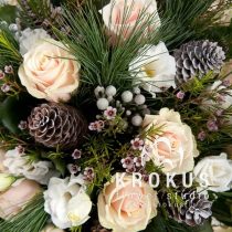 Ziemassvētku pušķis no rozēm pārsteigs ikvienu. Starp egļu zariem atver savas ziedlapiņas, delikātas krēmkrāsas rozes un baltas lizantes. Blakus tiem ir apvienoti dabas konusi un sudraba bumbiņas - waxflower. Maigs ziemas ziedu pušķis.