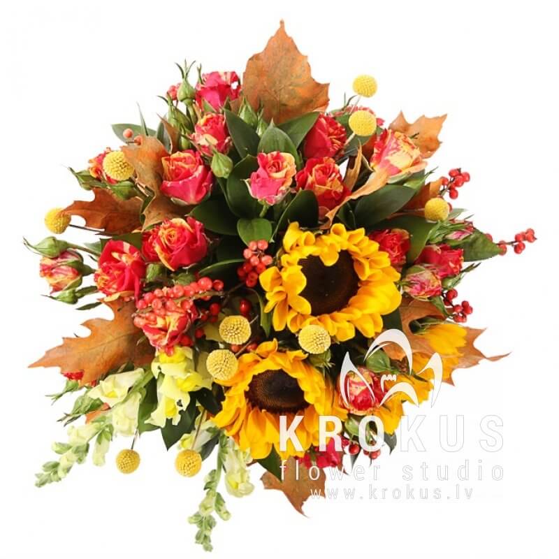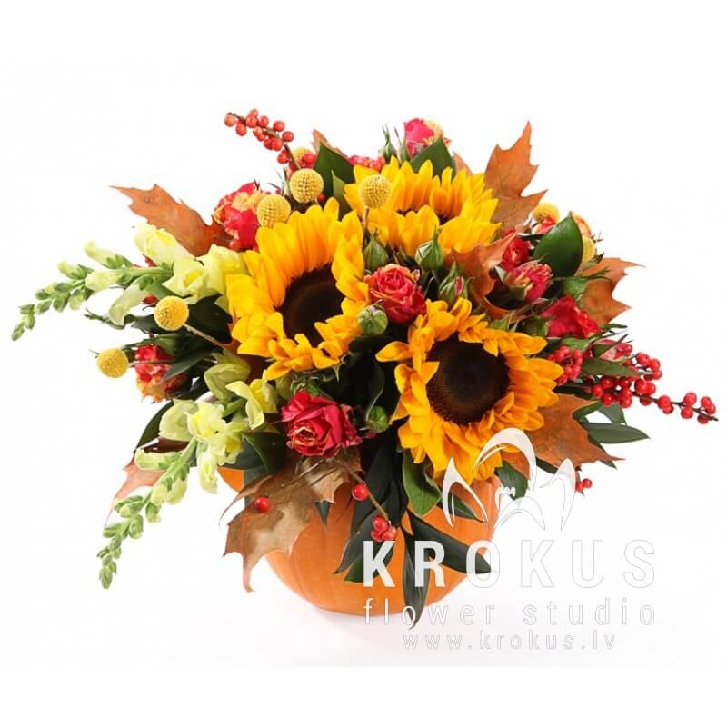 Яркий и насыщенный оттенок самых свежих подсолнухов и кустовых роз в сочетании с декоративными растениями, ягодами и жёлтыми листьями придают композиции «Осеннее солнце» поистине уникальный и неповторимый внешний вид. Изюминкой букета стала натуральная тыква, в которую помещаются все цветы.