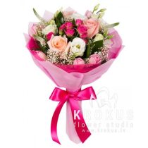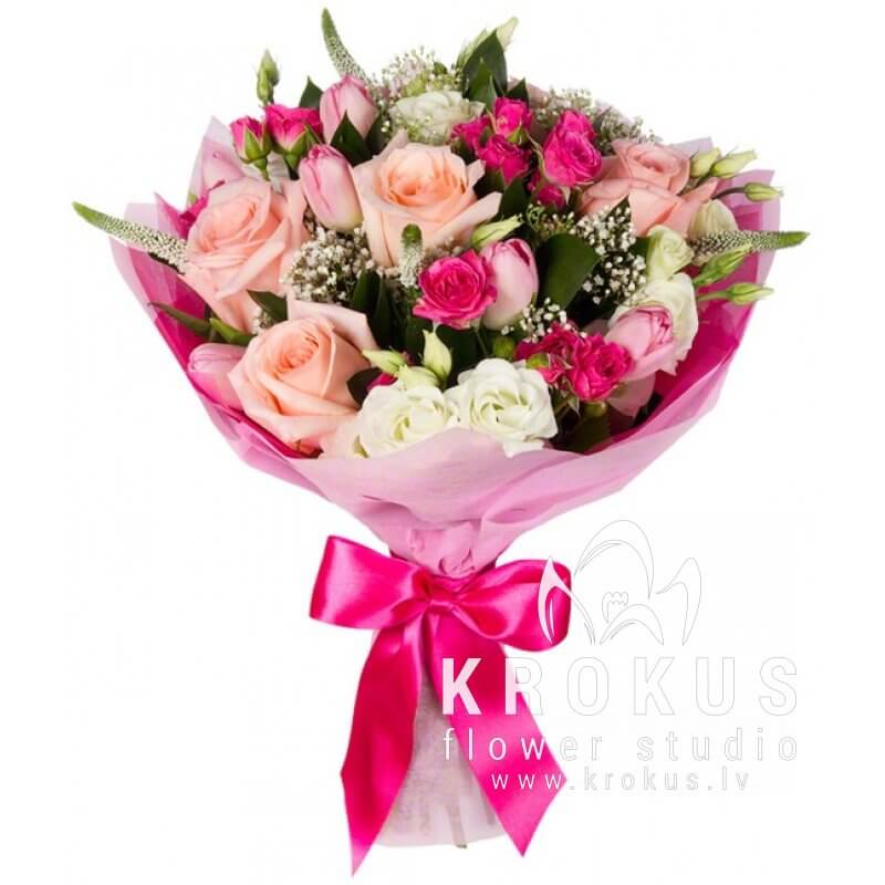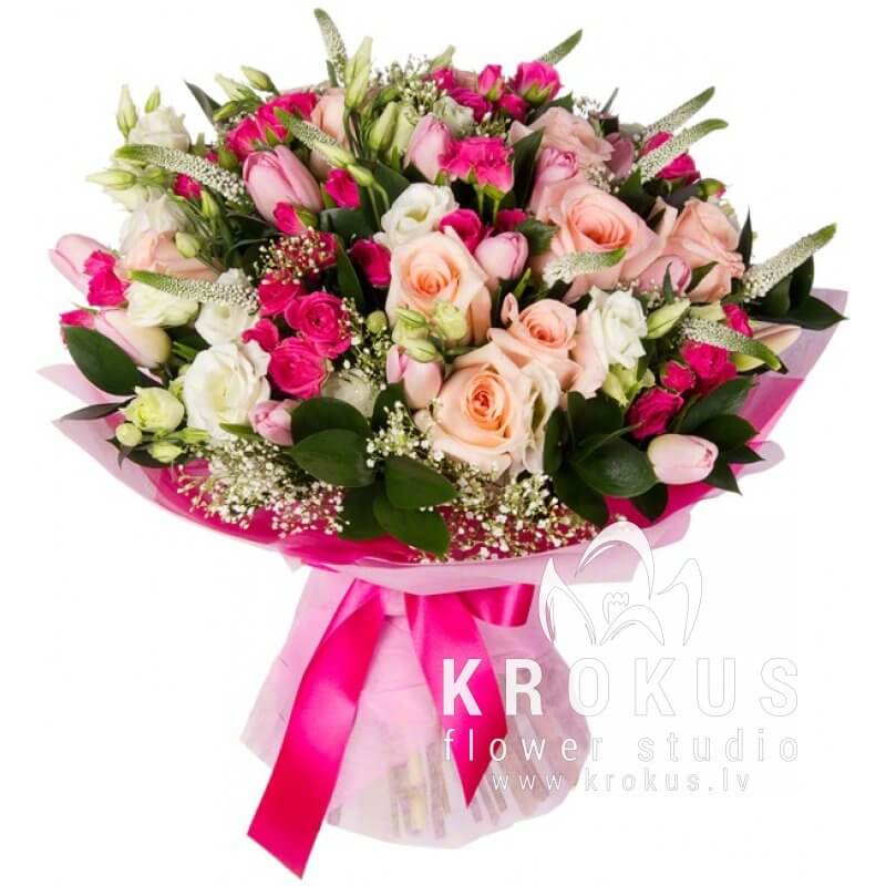 Поэтичный, обворожительный образ исключительной женственности. Которая подчеркнута использованием розовых оттенков. Здесь нет накала страстей и буйства красок. Это только начало, исток, рассветное утро. Искренность и трепетность чувств выражено нежными розами. Тюльпаны придают композиции весеннее настроение, а белоснежные эустомы легкие и хрупкие с виду, делают букет еще более светлым и праздничным. Дополняют его вероника, гипсофила. Рускус не только придает пышности букету, но и его освежает. Завершающая деталь упаковка из мягкого фетра, перевязанная атласной лентой. Выразите свой восторг перед обворожительной барышней или молодой дамой, лиричным розовым букетом, который будет ей к лицу.