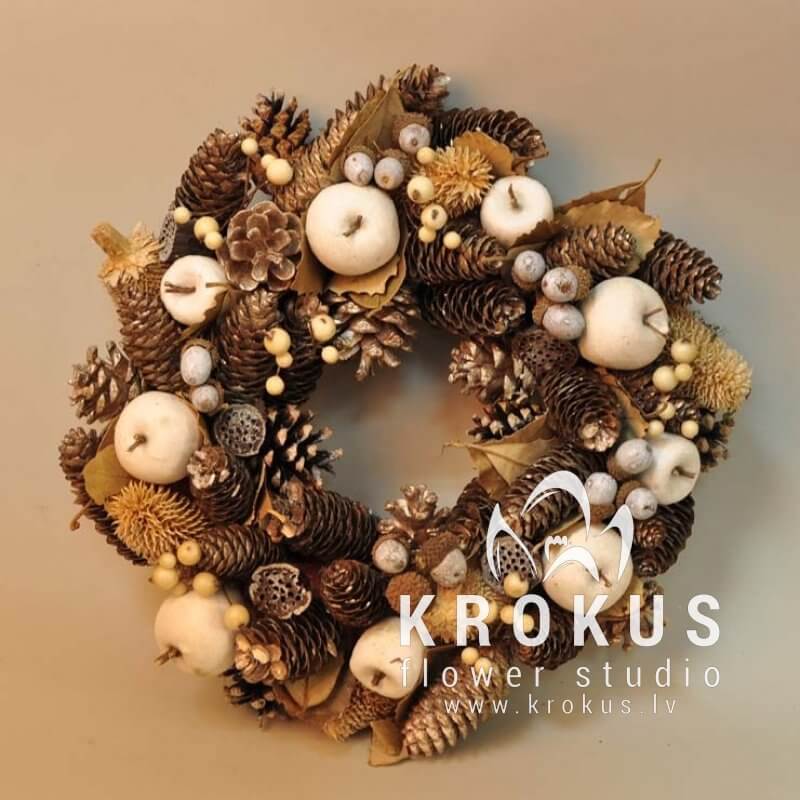 Рождественский венок ''Снежное яблочко'' создан из даров природы и украшен декоративными белыми яблоками. Изысканная позолоченная листва делает композицию роскошной и гламурной. Незабываемый подарок вызовет ностальгию по теплым зимним вечерам и принесет любовь, тепло и уют в дом его обладателя. Гости приглашенные на праздник будут в восторге, при виде такой красоты, наверняка захотят еще раз посетить ваш гостеприимный дом.