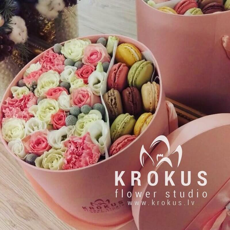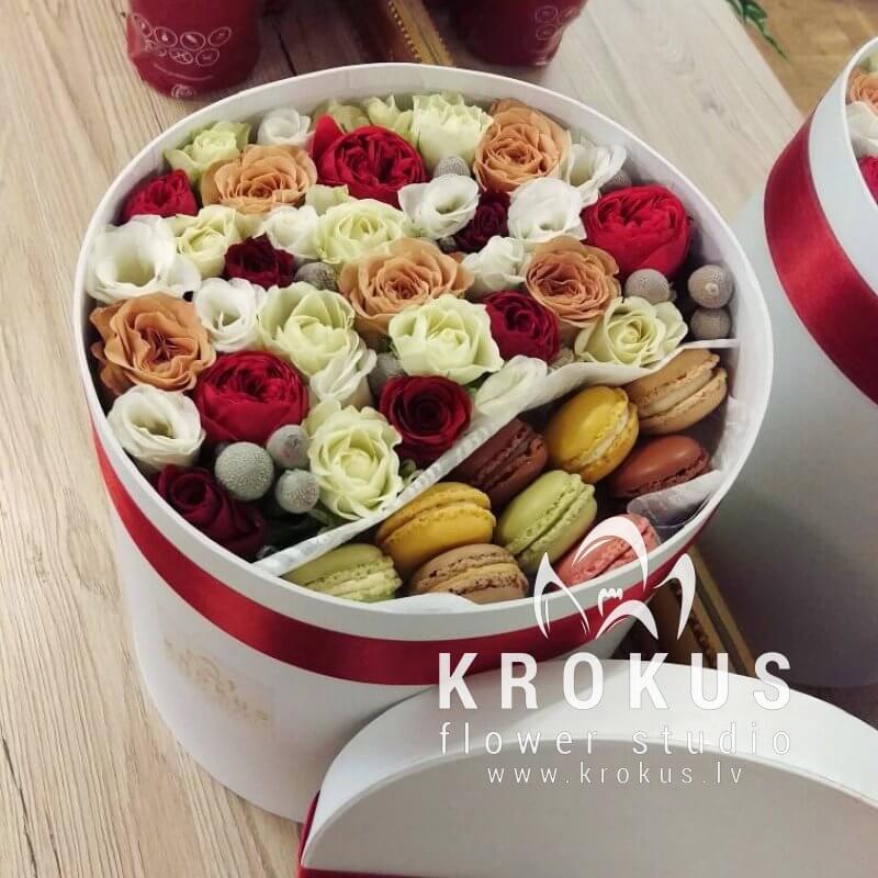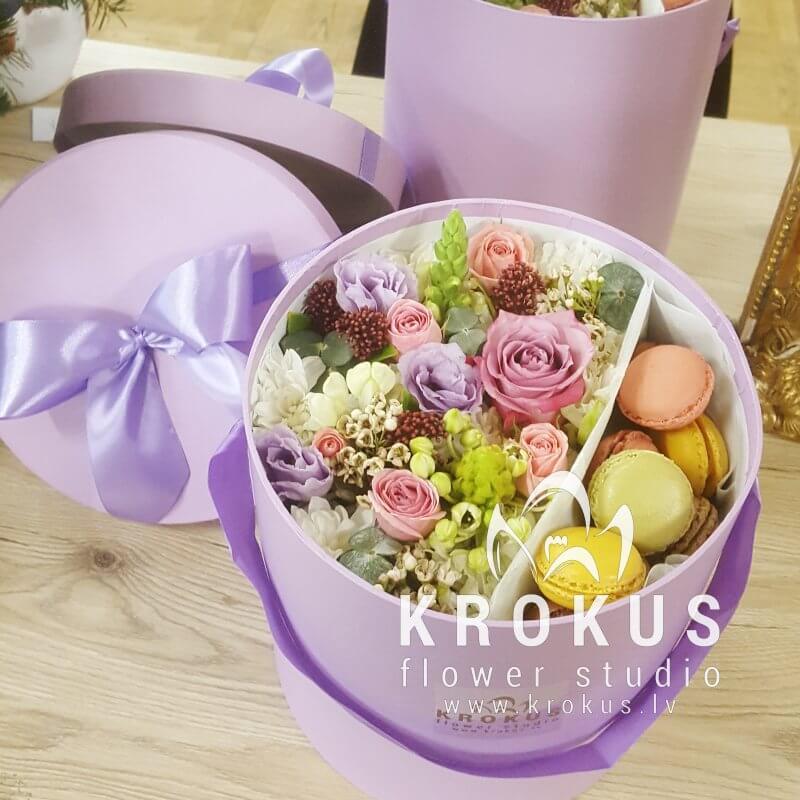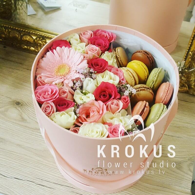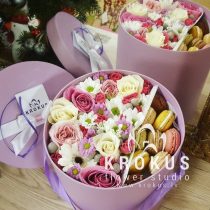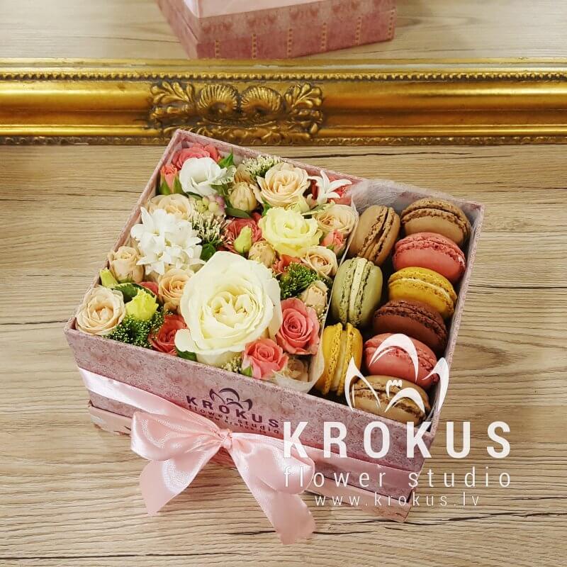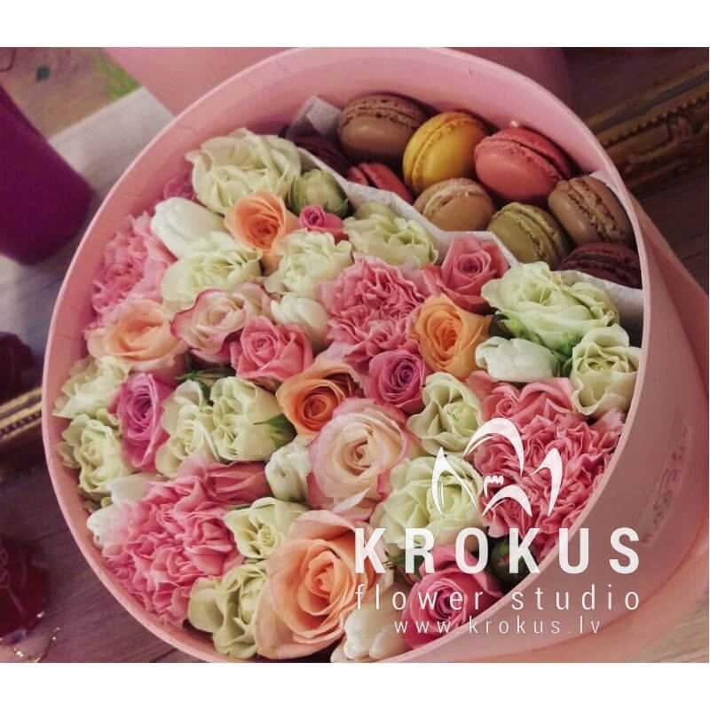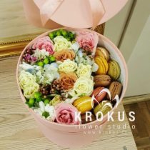 Цветочная композиция в коробке с макаронами - современный подарок, для людей идущих в одну ногу с модой. Хорошо подойдет на День рождения, как утренний вкусный сюрприз к кофе, или просто вы решили напомнить о себе, сделав цветочный комплимент.