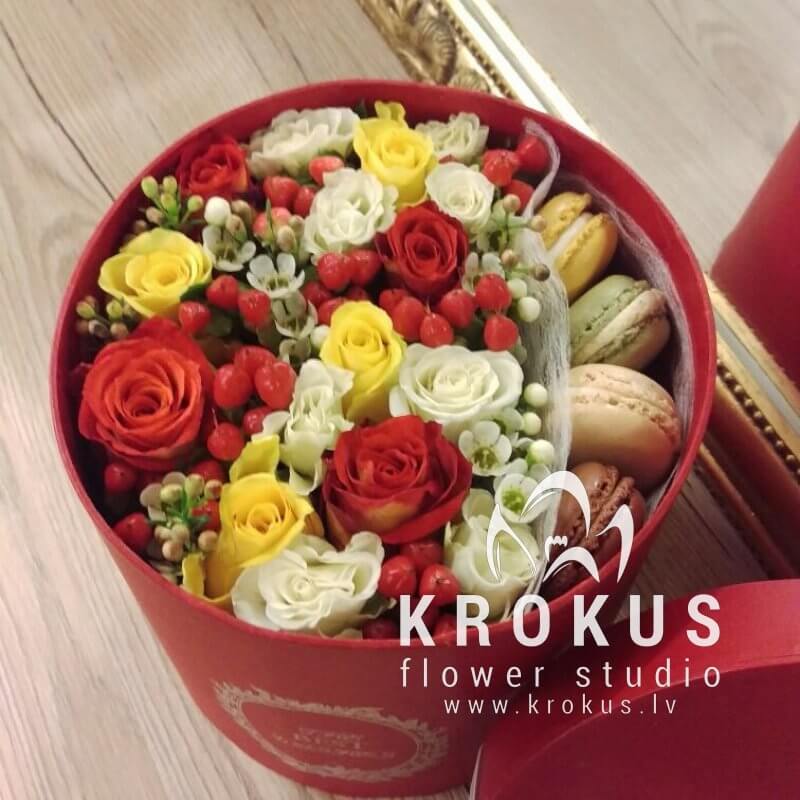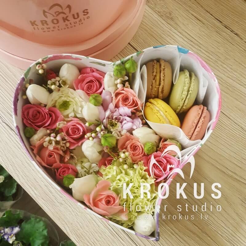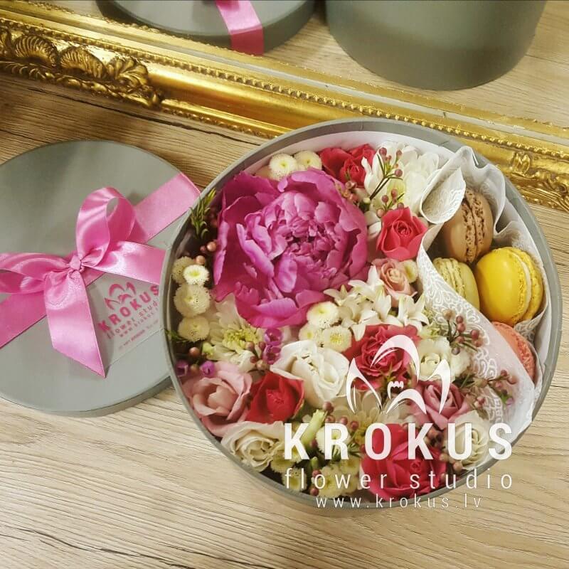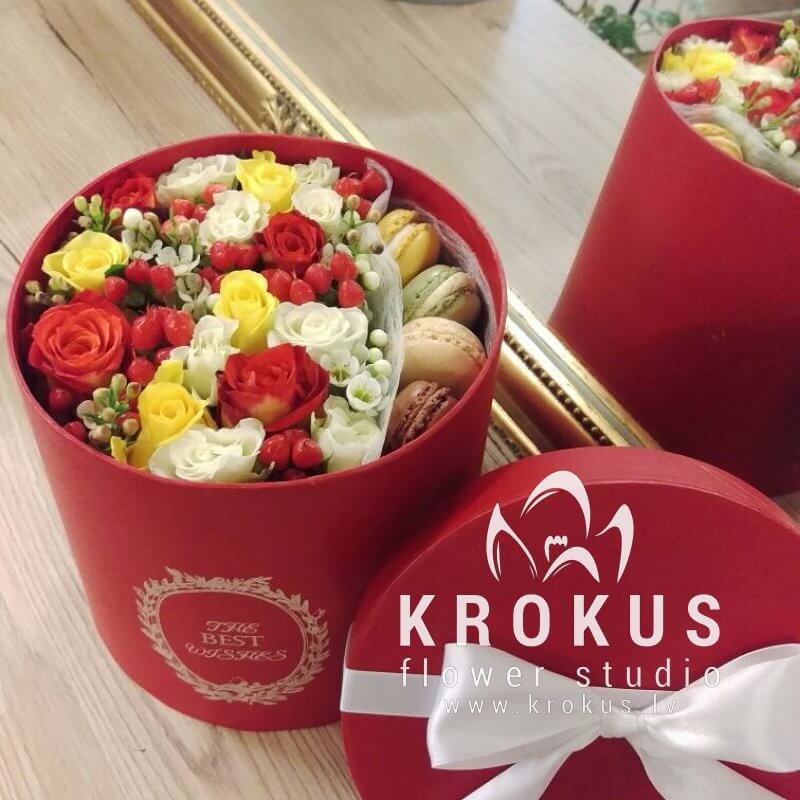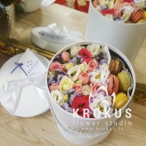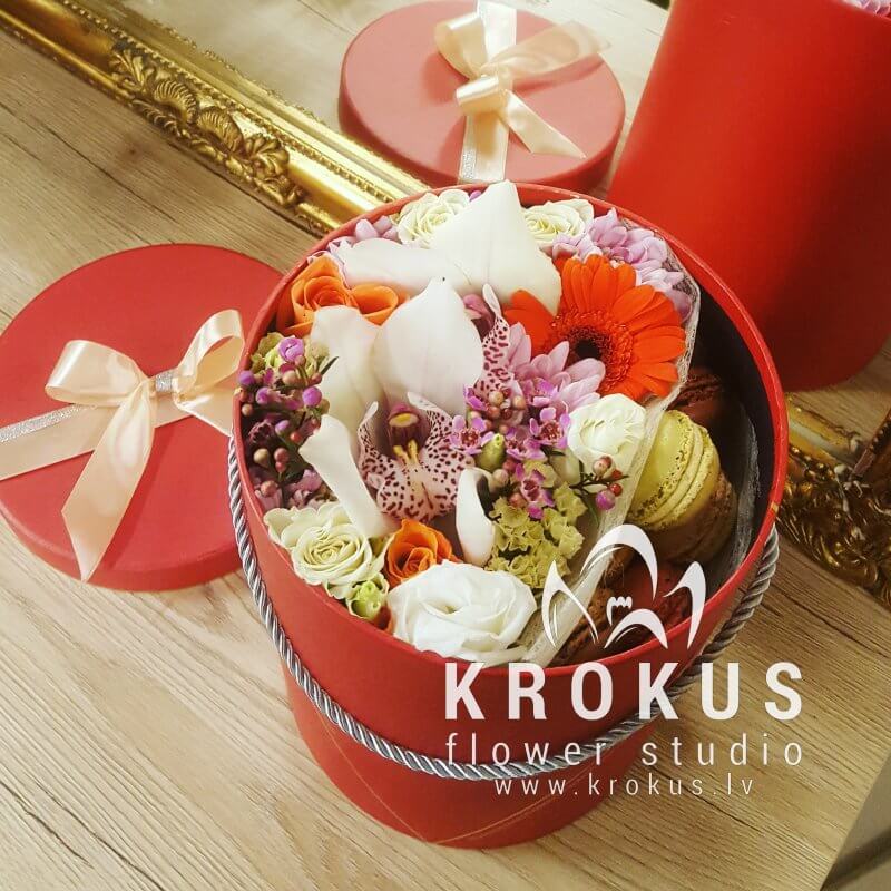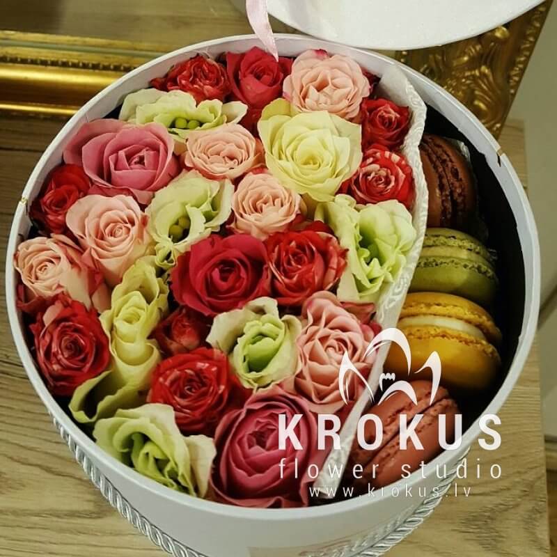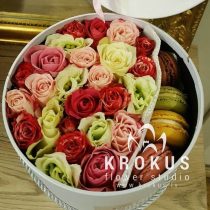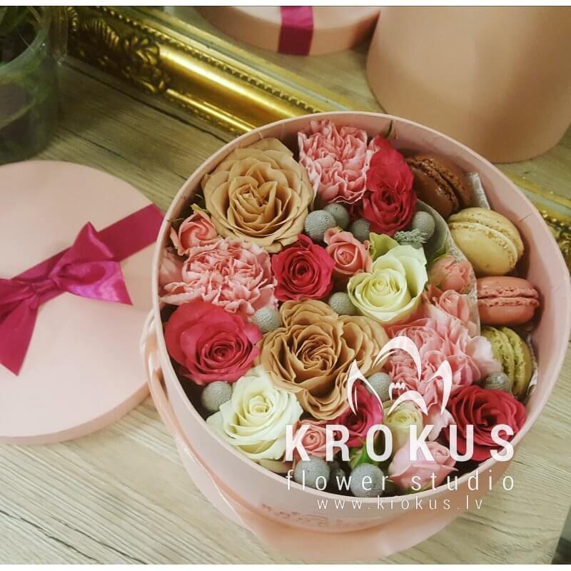 Цветочная композиция в коробке с макаронами - современный подарок, для людей идущих в одну ногу с модой. Хорошо подойдет на День рождения, как утренний вкусный сюрприз к кофе, или просто вы решили напомнить о себе, сделав цветочный комплимент.