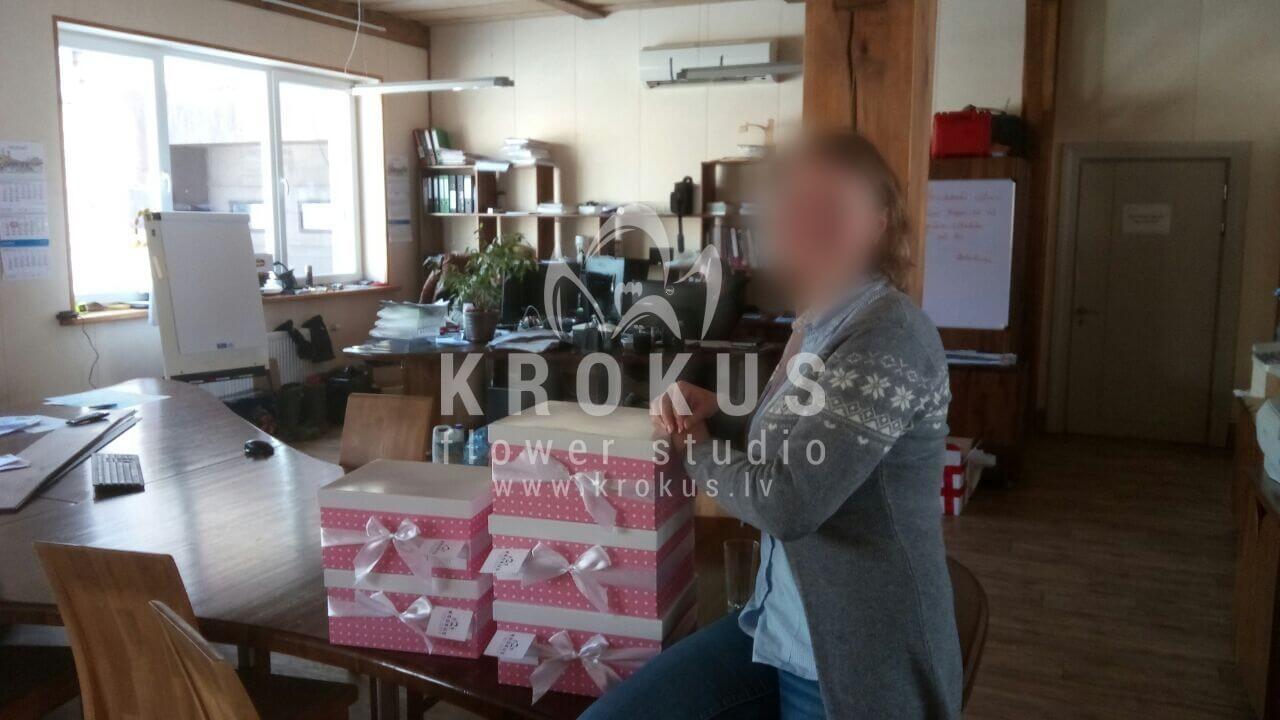 Mēs piegādājām vēl vienu pasūtījumu uz pilsētu Amata. Pasūtītājs vēlējās: Ziedu piegāde Flowerbox ar macarooniem (Izmērs: