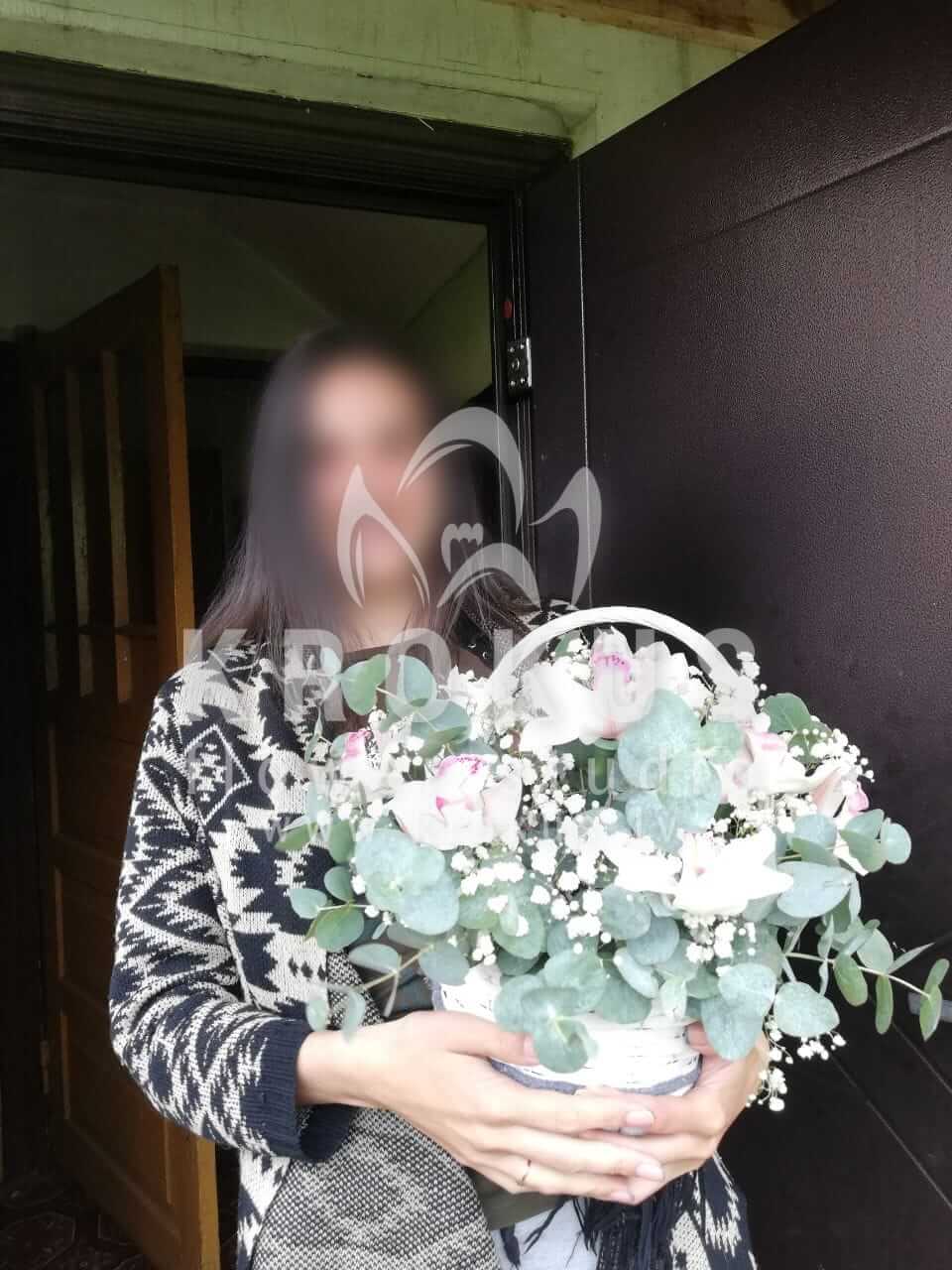 Ziedu sastāvā: Orhidejas, Gypsophila (Ģipsene), Eikalipts.