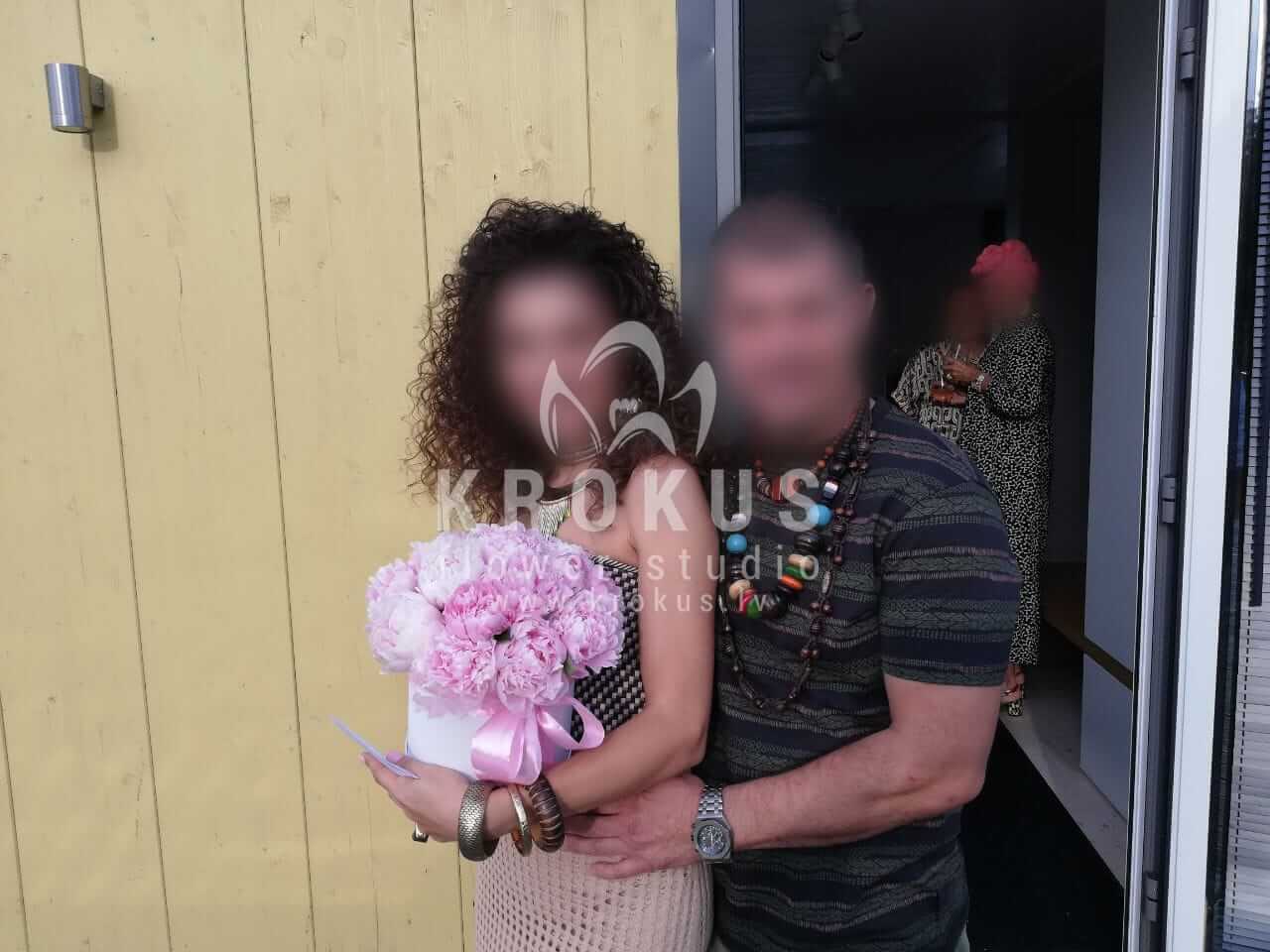 Mēs piegādājām vēl vienu pasūtījumu uz pilsētu Baltezers. Pasūtītājs vēlējās: Ziedu piegāde Rozā peonijas cepuru kastē