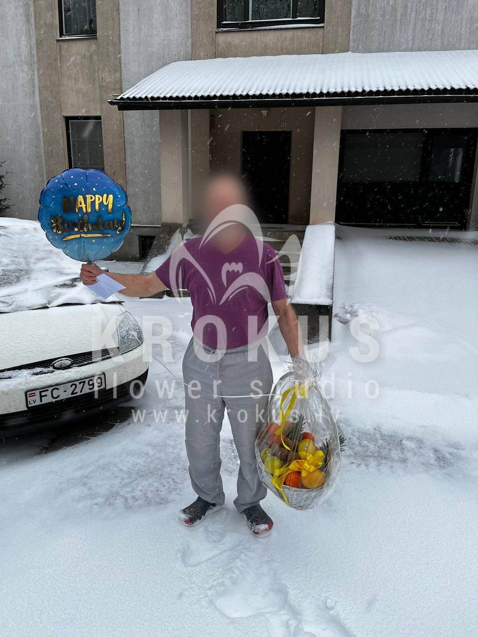 Mēs piegādājām vēl vienu pasūtījumu uz pilsētu Daugavmala. Pasūtītājs vēlējās: Ziedu piegāde Augļu grozs. Ziedu piegāde Balons Daudz laimes