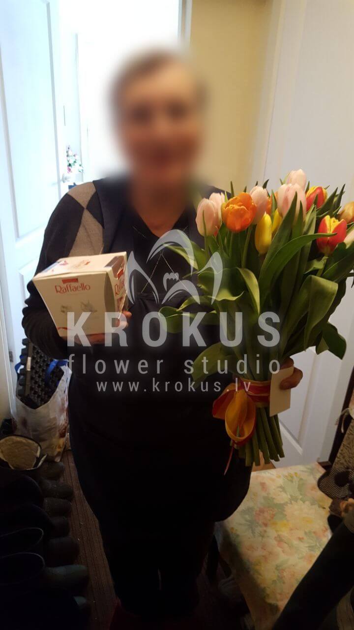 Mēs piegādājām vēl vienu pasūtījumu uz pilsētu Eleja. Pasūtītājs vēlējās: Ziedu piegāde Tulpju pušķis "Neapole" (Elpojošs, svaigs pavasara ziedu pušķis. Veidots no sarkanam, dzeltenam un baltam tulpēm, krāsu spilgtums neaizmirstami pārsteigs jebkuru jūsu ģimenes locekli vai mīļoto cilvēku. Elegants, daudzveidīgs pušķis ar bagātīgu krāsu spektru nevar būt neideāls. Tas dāvās smalka pavasara aromāta šarmu. Šo pušķi nav iespējams nepamanīt. Dāviniet to saviem mīļajiem. Veiciet varoņdarbus – padariet viņus laimīgus!). Ziedu piegāde Raffaello 150g (Konfektes RAFFAELLO, 150g