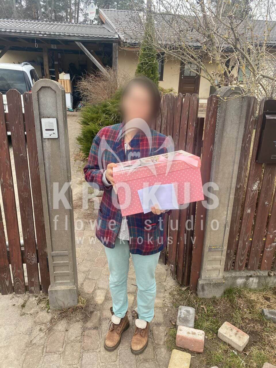 Mēs piegādājām vēl vienu pasūtījumu uz pilsētu Garkalne. Pasūtītājs vēlējās: Ziedu piegāde Flowerbox ar macarooniem (Izmērs: