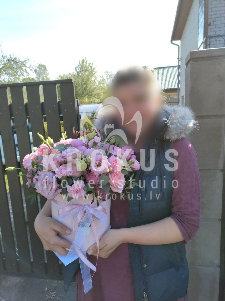 Ziedu sastāvā: Rozā rozes, Lizantes, Peonveidīgās rozes, Neļķes, Genista, Eikalipts, Pistācija.
