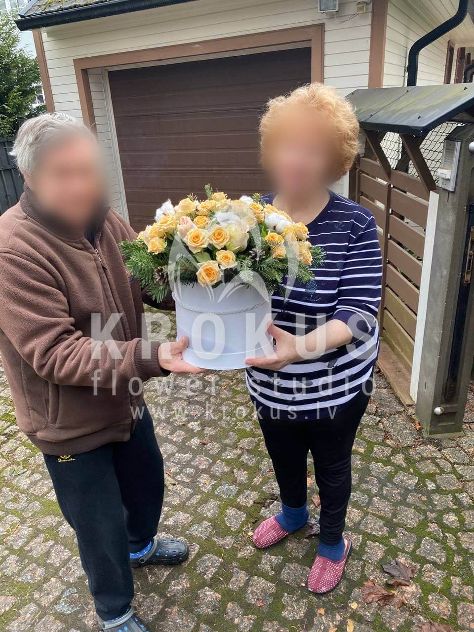 Ziedu sastāvā: Krūmrozes, Krēmkrāsas rozes, Nobilis egle, Kokvilna, Dekors, Stilīga kastīte.