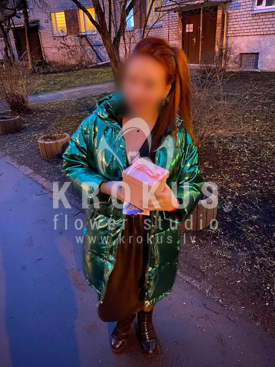 Mēs piegādājām vēl vienu pasūtījumu uz pilsētu Jūrmala. Pasūtītājs vēlējās: Ziedu piegāde Kastīte ar saldumiem. Ziedu piegāde Kartiņa 6x6cm