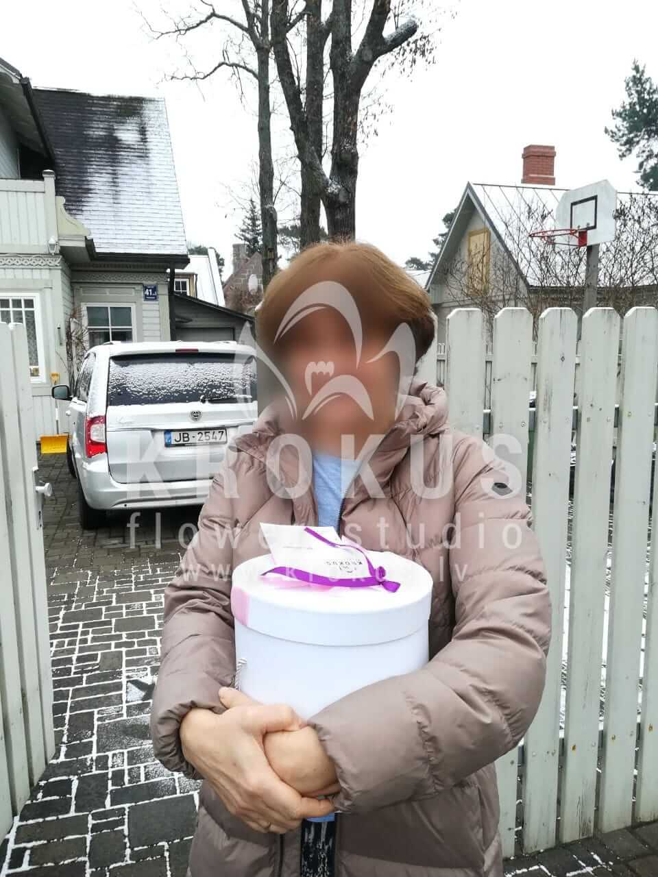 Mēs piegādājām vēl vienu pasūtījumu uz pilsētu Jūrmala. Pasūtītājs vēlējās: Ziedu piegāde Flowerbox ar macarooniem (Izmērs: