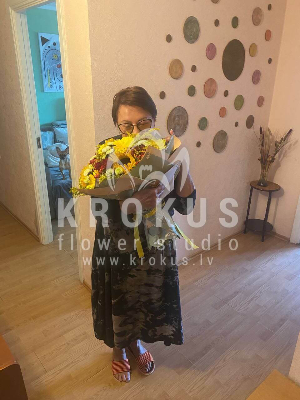 Ziedu sastāvā: Saulespuķes, Krūmrozes, Krizantēmas, Hypericum, Solidago, Gerberas, Pļavas puķes.