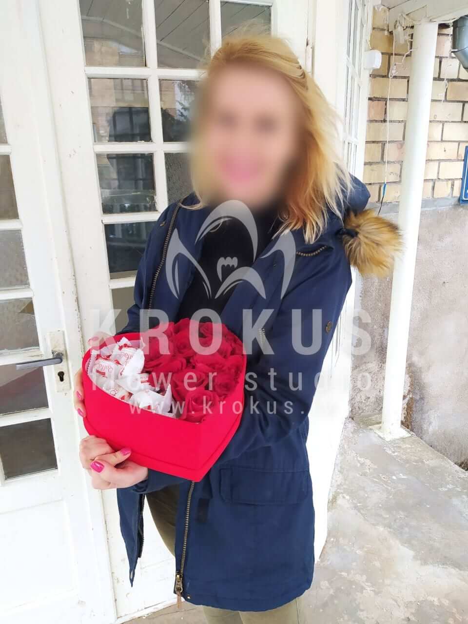 Ziedu sastāvā: Sarkanas rozes, Konfektes, Stilīga kastīte.