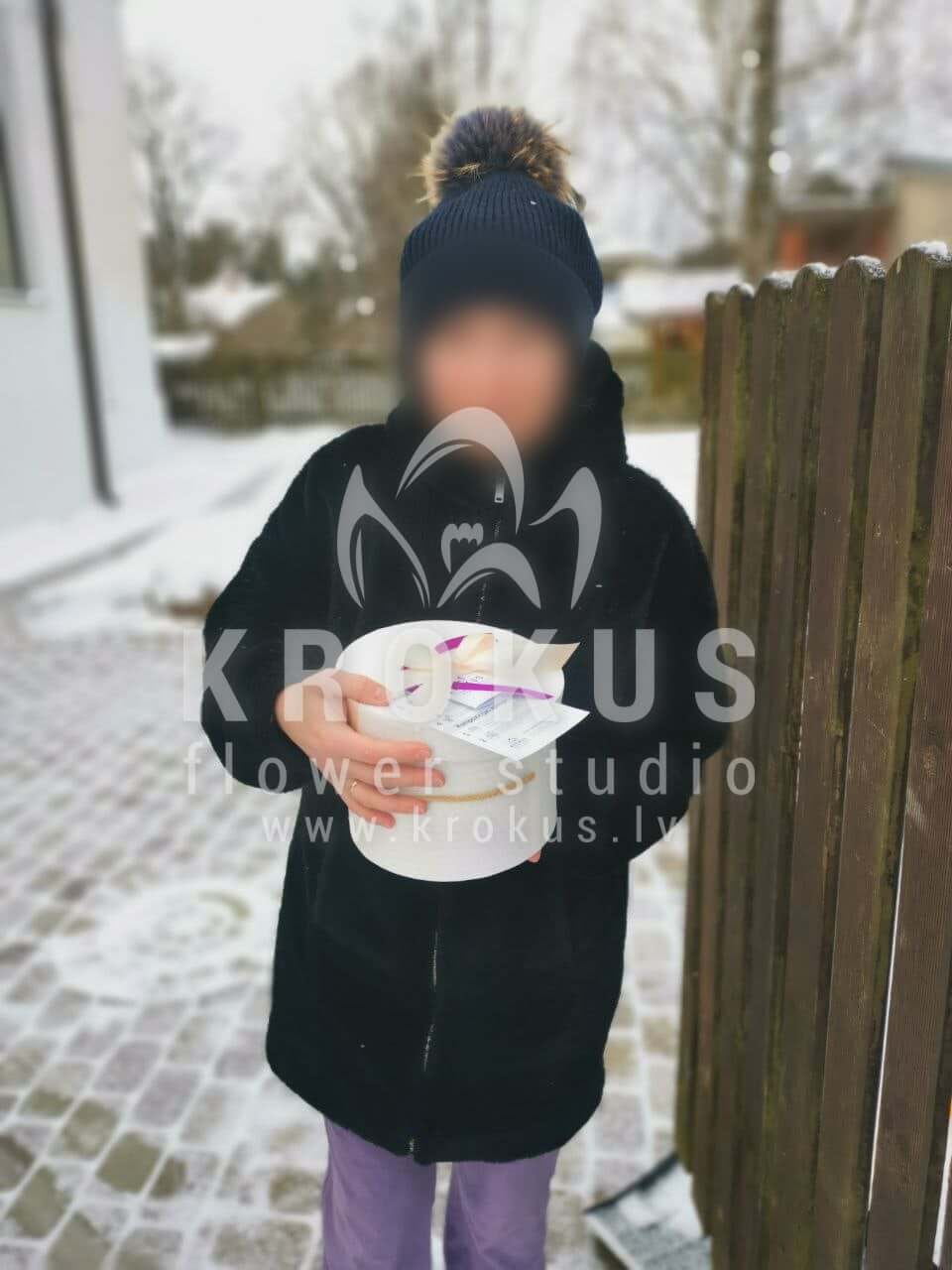 Mēs piegādājām vēl vienu pasūtījumu uz pilsētu Kalngale. Pasūtītājs vēlējās: Ziedu piegāde Flowerbox ar makarūniem (macaron) (Izmērs: