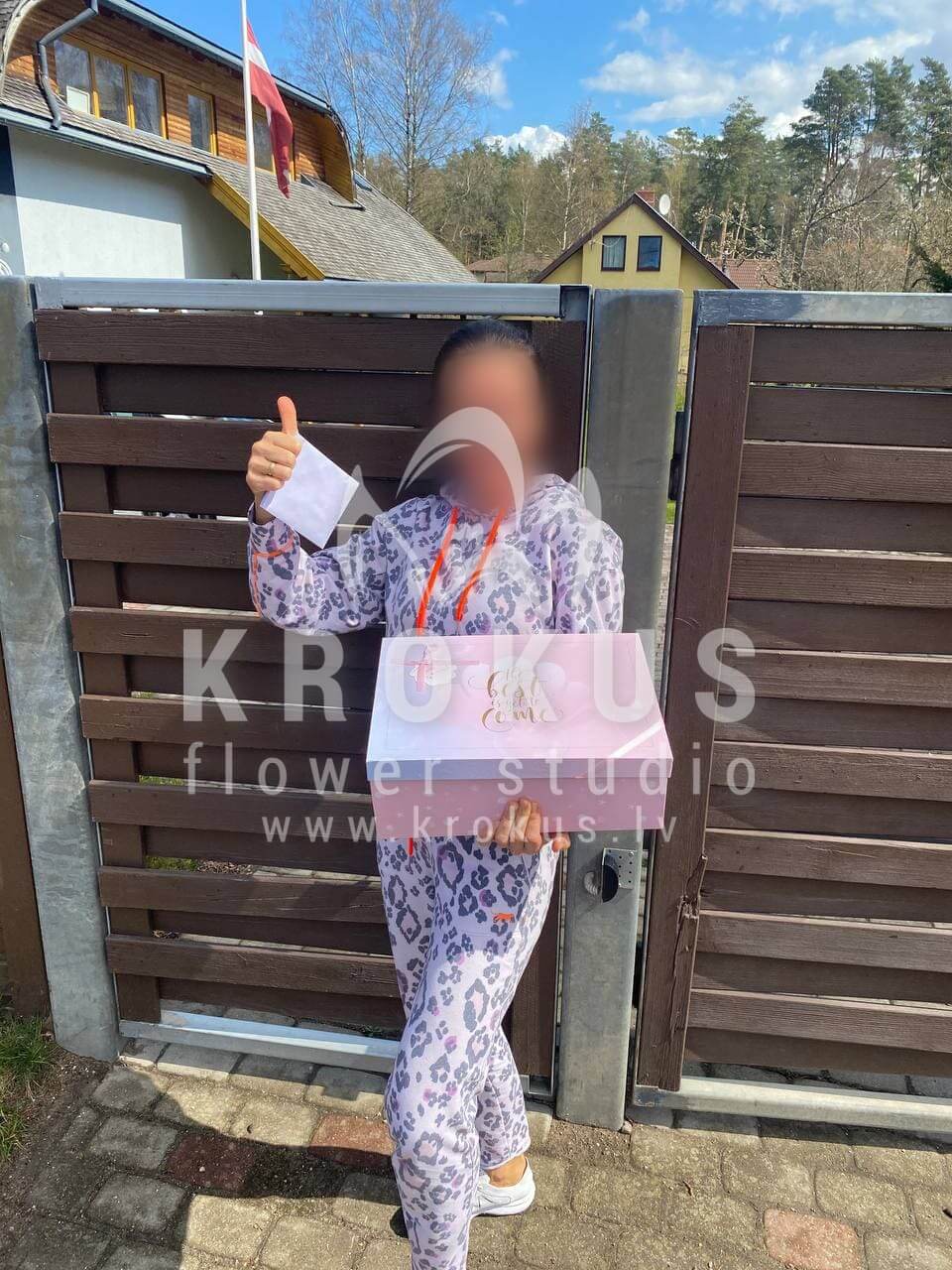 Mēs piegādājām vēl vienu pasūtījumu uz pilsētu Kalngale. Pasūtītājs vēlējās: Ziedu piegāde Flowerbox ar macarooniem (Izmērs: