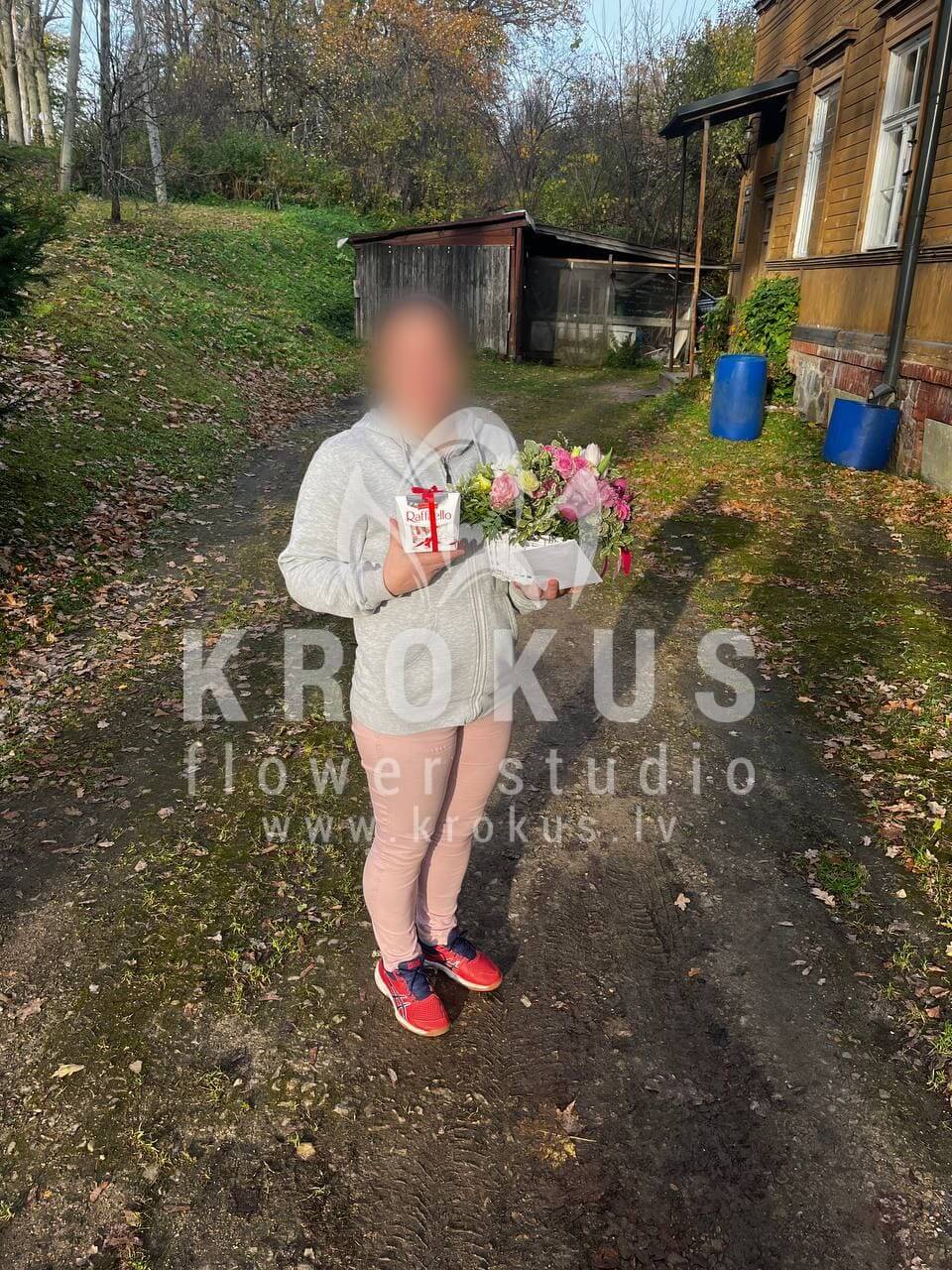 Mēs piegādājām vēl vienu pasūtījumu uz pilsētu Līgatne. Pasūtītājs vēlējās: Ziedu piegāde Sāra (Pušķa sastāvs var nedaudz atšķirties no attēlā redzamā, atkarībā no sezonas!). Ziedu piegāde Raffaello 150g (Konfektes RAFFAELLO, 150g