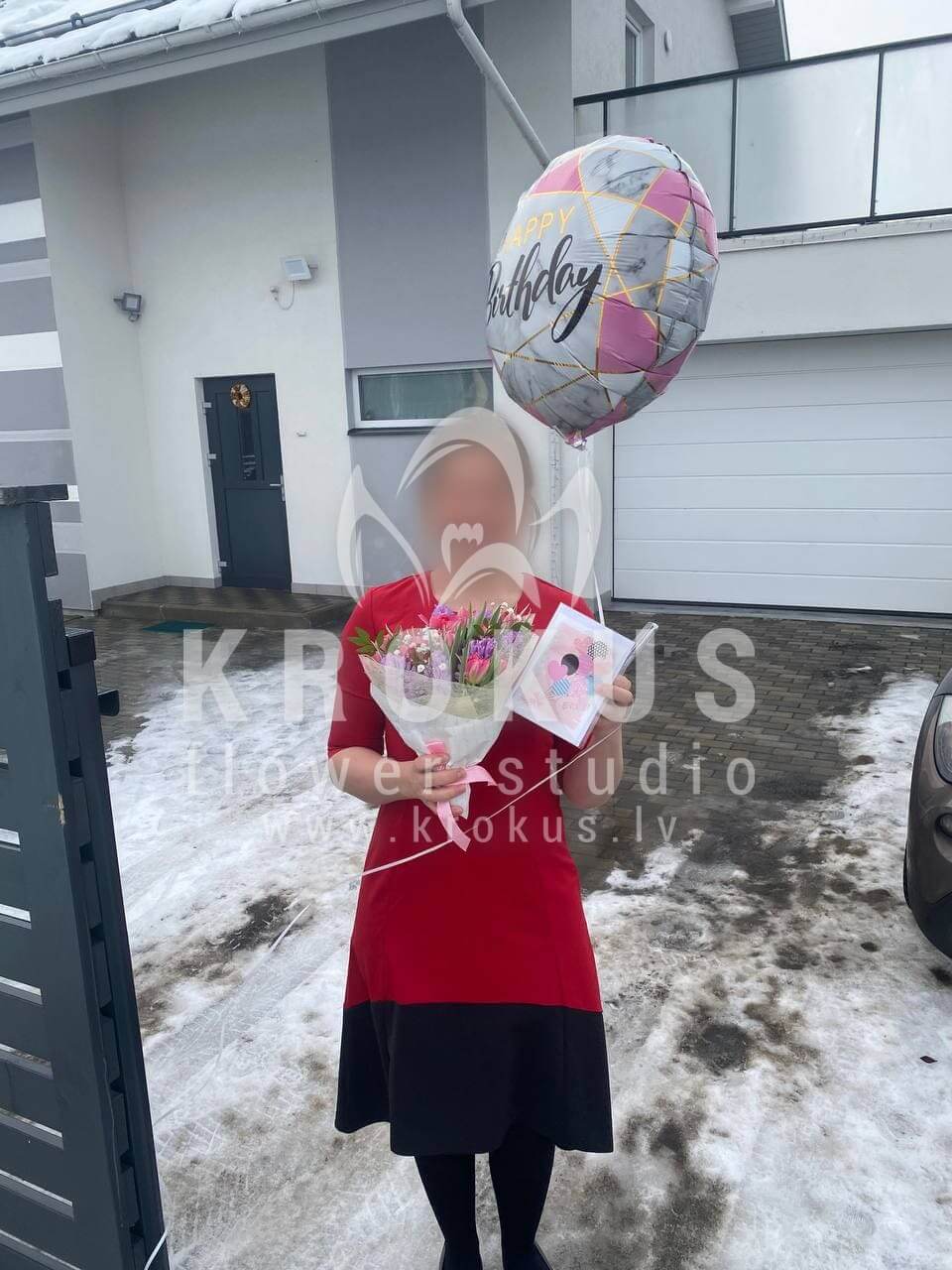 Mēs piegādājām vēl vienu pasūtījumu uz pilsētu Lubauši. Pasūtītājs vēlējās: Ziedu piegāde Pavasara pušķis. Ziedu piegāde Follija balons Daudz Laimes 46cm