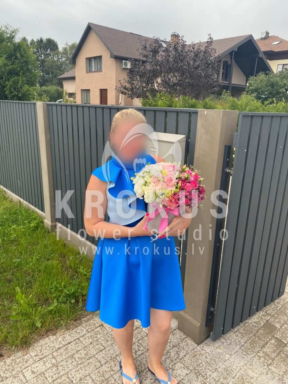 Ziedu sastāvā: Hortenzijas, Rozā rozes, Krūmrozes, Peonveidīgās rozes, Lizantes, Dālija, Astrancija, Оzothamnus, Skimmija.