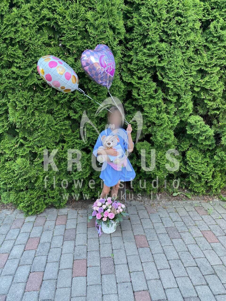 Mēs piegādājām vēl vienu pasūtījumu uz pilsētu Mārupe. Pasūtītājs vēlējās: Ziedu piegāde Grozs rozīgi-violētos toņos (Pušķa sastāvs var nedaudz atšķirties no attēlā redzamā, atkarībā no sezonas!). Ziedu piegāde Bēšā lācis 27cm. Ziedu piegāde Balons Daudz laimes. Ziedu piegāde Balons Princese (18*46cm)
