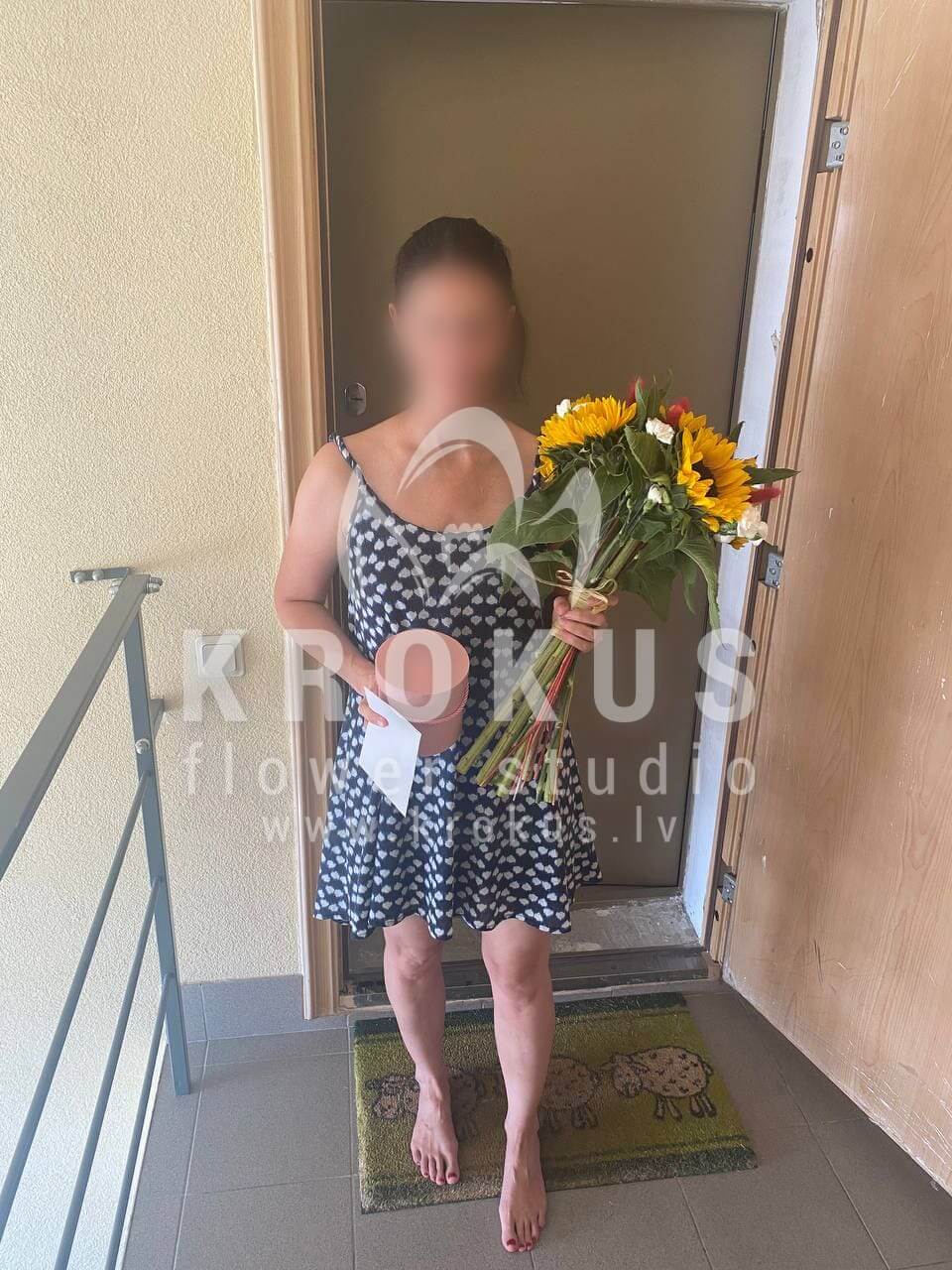 Mēs piegādājām vēl vienu pasūtījumu uz pilsētu Mārupe. Pasūtītājs vēlējās: Ziedu piegāde Pušķis no saulespuķēm (Pušķa sastāvs var nedaudz atšķirties no attēlā redzamā, atkarībā no sezonas!). Ziedu piegāde Macaroons Cepumi 12gab. (Macaroon cepumi – maigas tekstūras un bagātīgu garšu harmonija, kas iepriecina ar katru kumosu. Šie krāsainie, smalkie franču cepumi piešķir svētku noskaņu un ir ideāls papildinājums pie ziedu dāvanas. Kraukšķīga ārpuse un samtaina, krēmīga pildījuma viducis – Macaroon cepumi rada neaizmirstamu garšas baudījumu, kas uzbur siltas un prieka pilnas emocijas. Pievienojiet šo izsmalcināto desertu mūsu ziedu kompozīcijai un ļaujiet saldajiem mirkļiem padarīt dāvināšanas brīdi patiesi īpašu.)