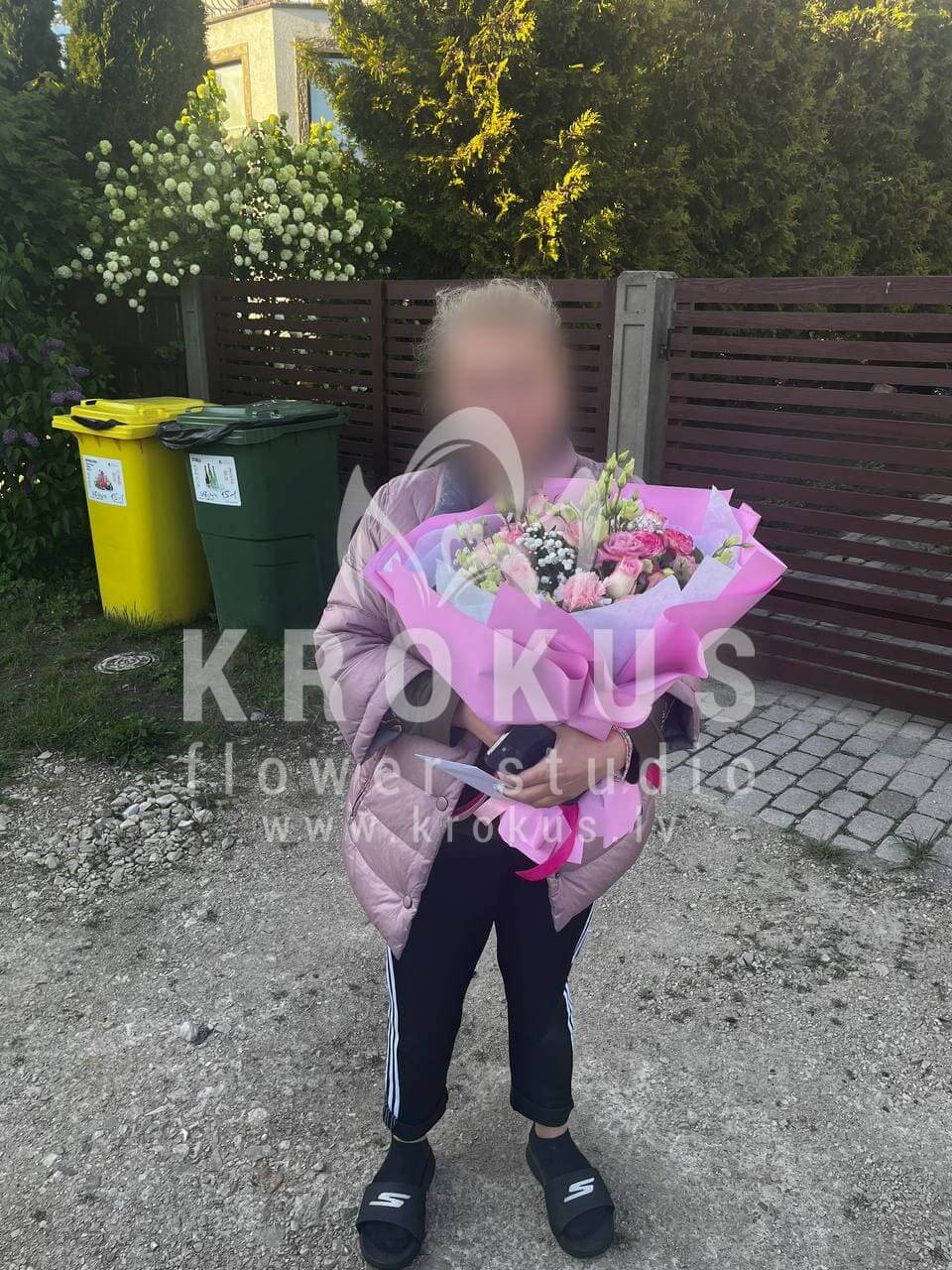 Ziedu sastāvā: Rozā rozes, Krūmrozes, Lizantes, Veronika, Tulpes, Gypsophila (Ģipsene), Ruskuss.