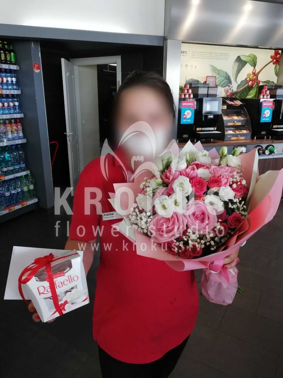 Ziedu sastāvā: Rozā rozes, Krūmrozes, Lizantes, Veronika, Tulpes, Gypsophila (Ģipsene), Ruskuss.