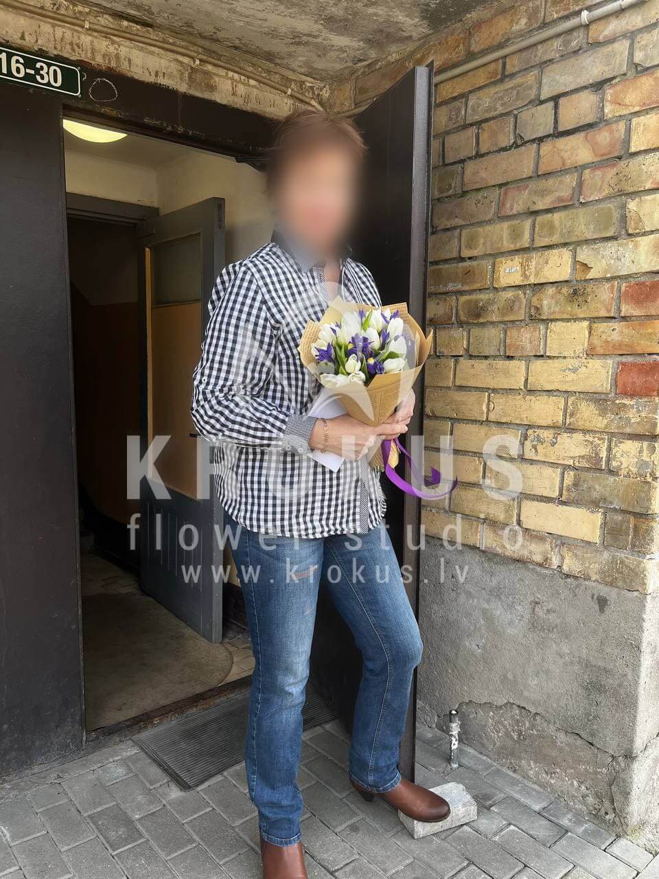 Mēs piegādājām vēl vienu pasūtījumu uz pilsētu Olaine. Pasūtītājs vēlējās: Ziedu piegāde Īrisu un tulpju pušķis