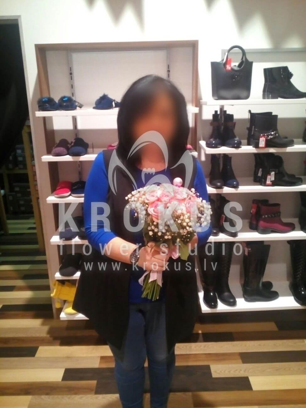 Ziedu sastāvā: Rozā rozes, Gypsophila (Ģipsene).