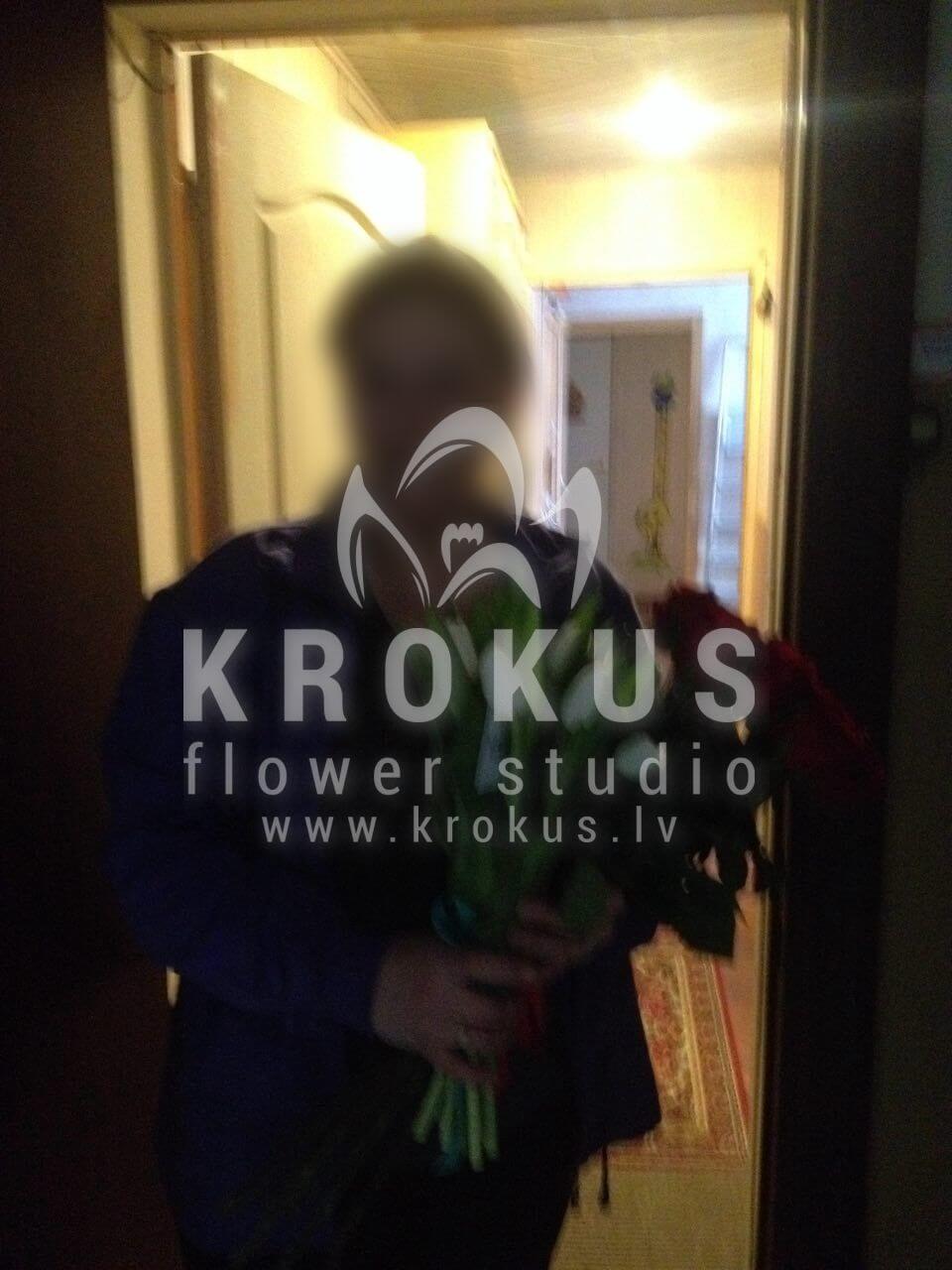 Mēs piegādājām vēl vienu pasūtījumu uz pilsētu . Pasūtītājs vēlējās: Ziedu piegāde Baltas tulpes. Ziedu piegāde Sarkanas rozes XXL 60cm