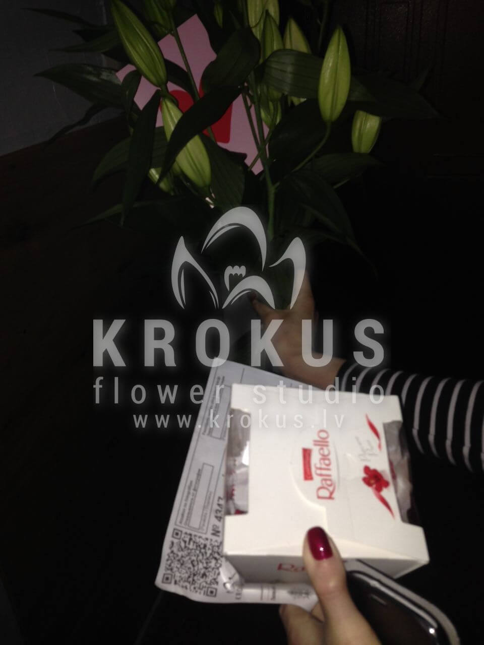 Mēs piegādājām vēl vienu pasūtījumu uz pilsētu . Pasūtītājs vēlējās: Ziedu piegāde Lilijas. Ziedu piegāde Raffaello 150g (Konfektes RAFFAELLO, 150g