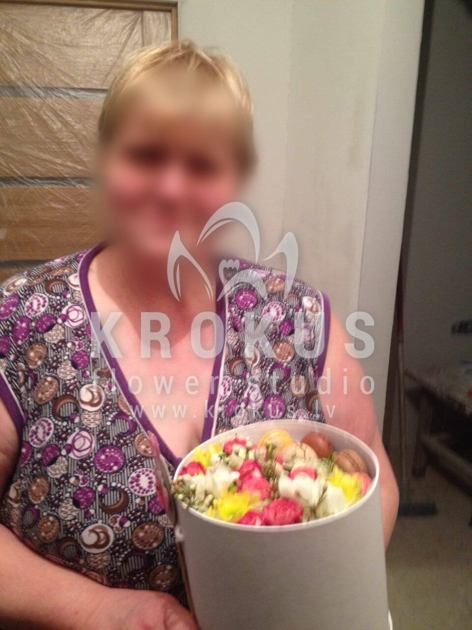 Mēs piegādājām vēl vienu pasūtījumu uz pilsētu . Pasūtītājs vēlējās: Ziedu piegāde Flowerbox ar macarooniem (Izmērs: